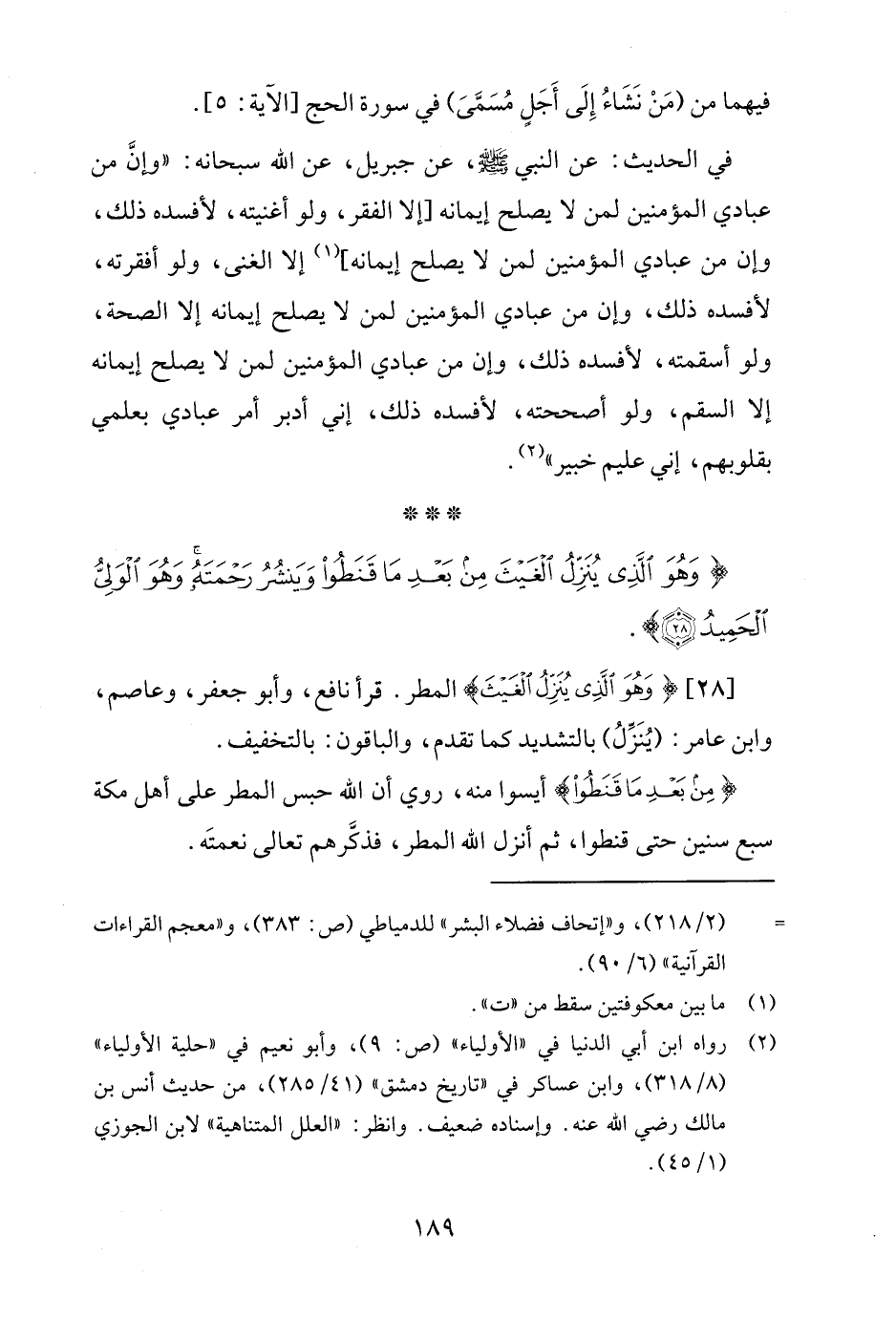 [28] {وَهُوَ الَّذِي يُنَزِّلُ الْغَيْثَ} المطر. قرأ نافع، وأبو جعفر، وعاصم، وابن عامر: (يُنَزِّلُ) بالتشديد كما تقدم، والباقون: بالتخفيف.