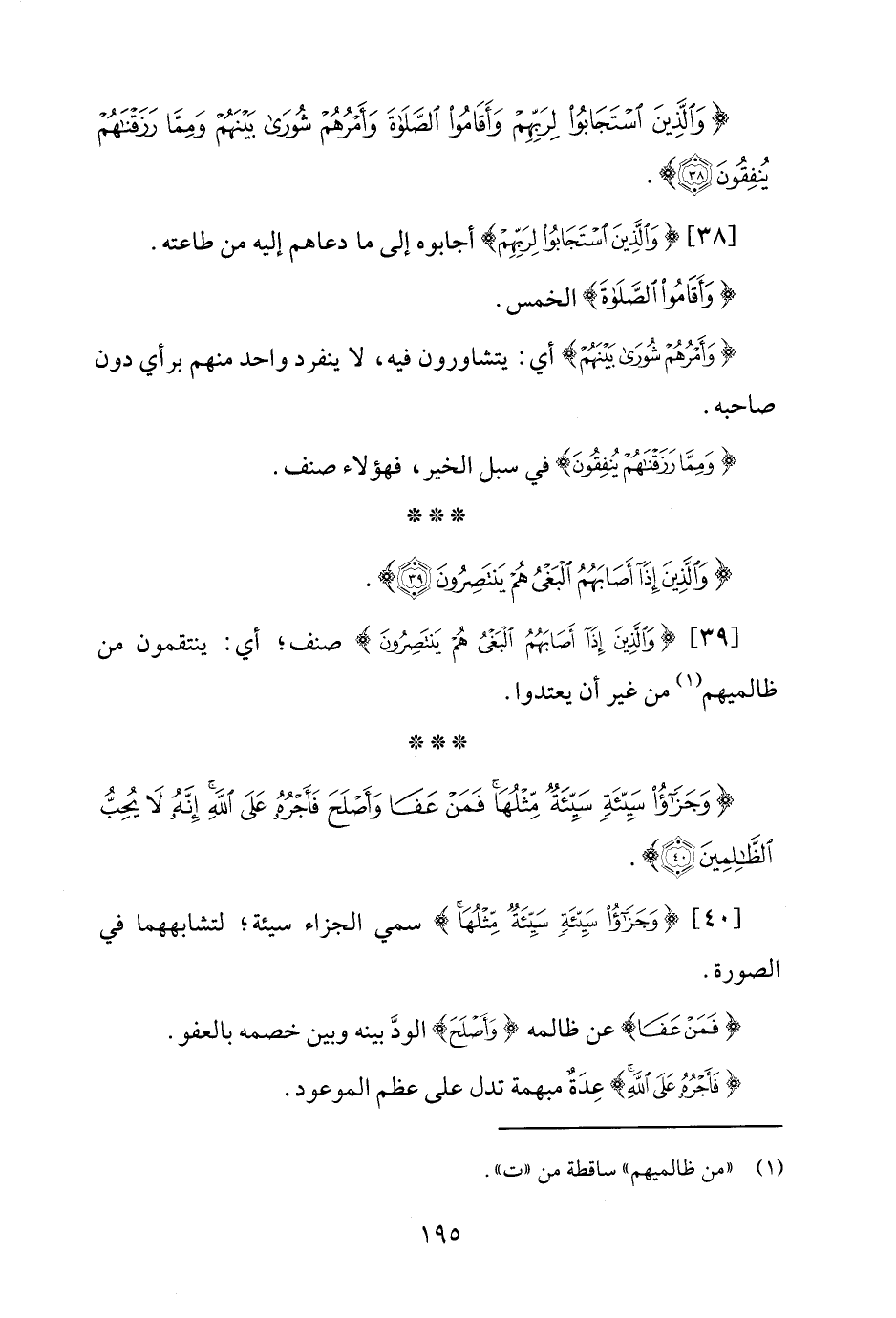 [39] {وَالَّذِينَ إِذَا أَصَابَهُمُ الْبَغْيُ هُمْ يَنْتَصِرُونَ} صنف؛ أي: ينتقمون من ظالميهم (¬1) من غير أن يعتدوا.