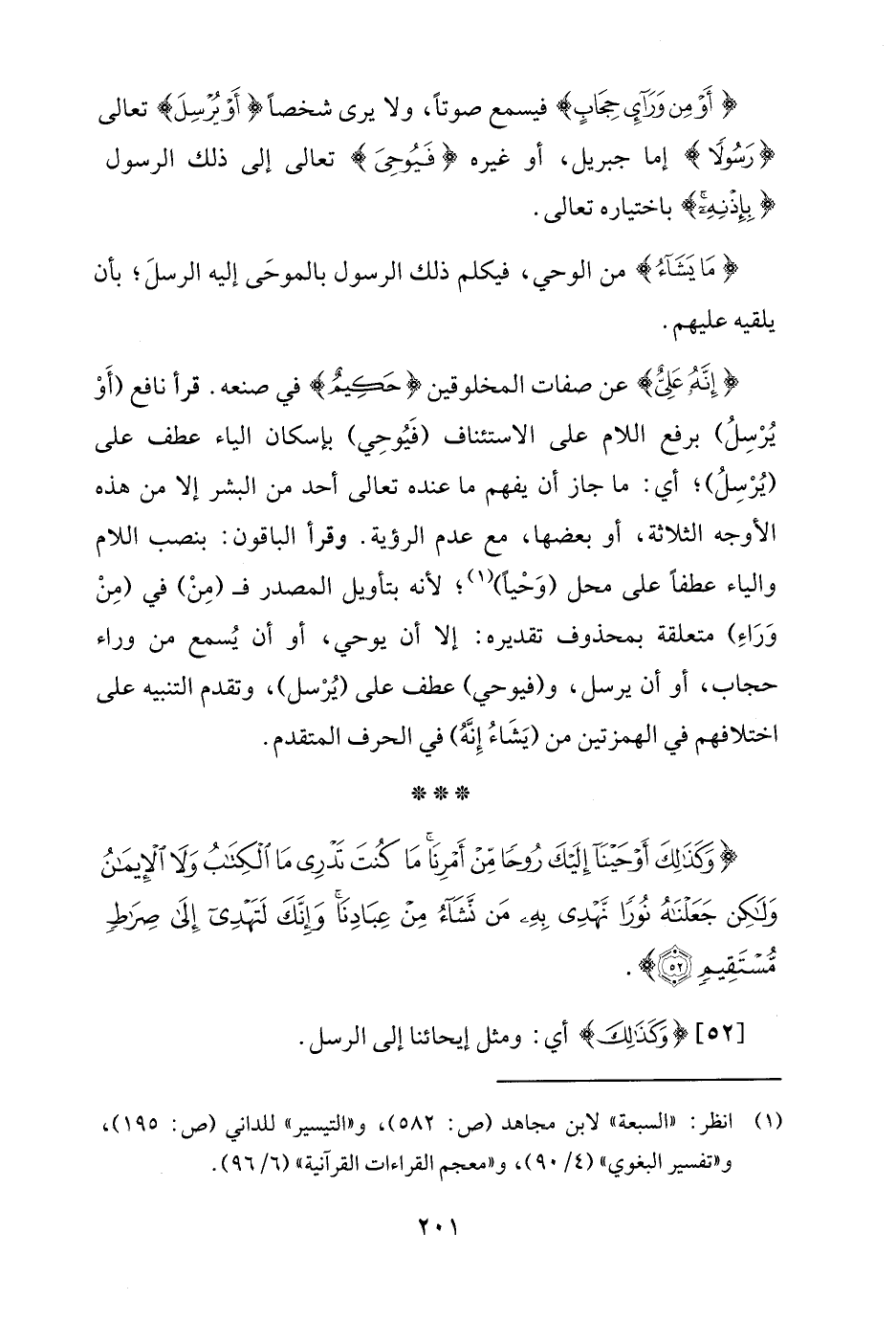 {إِنَّهُ عَلِيٌّ} عن صفات المخلوقين {حَكِيمٌ} في صنعه. قرأ نافع (أَوْ يُرْسِلُ) برفع اللام على الاستئناف (فَيُوحِي) بإسكان الياء عطف على (يُرْسِلُ)؛ أي: ما جاز أن يفهم ما عنده تعالى أحد من البشر إلا من هذه الأوجه الثلاثة، أو بعضها، مع عدم الرؤية. وقرأ الباقون: بنصب اللام والياء عطفًا على محل (وَحْيًا) (¬1)؛ لأنه بتأويل المصدر فـ (مِنْ) في (مِنْ وَرَاءِ) متعلقة بمحذوف تقديره: إلا أن يوحي، أو أن يُسمع من وراء حجاب، أو أن يرسل، و (فيوحي) عطف على (يُرْسل)، وتقدم التنبيه على اختلافهم في الهمزتين من (يَشَاءُ إِنَّهُ) في الحرف المتقدم.