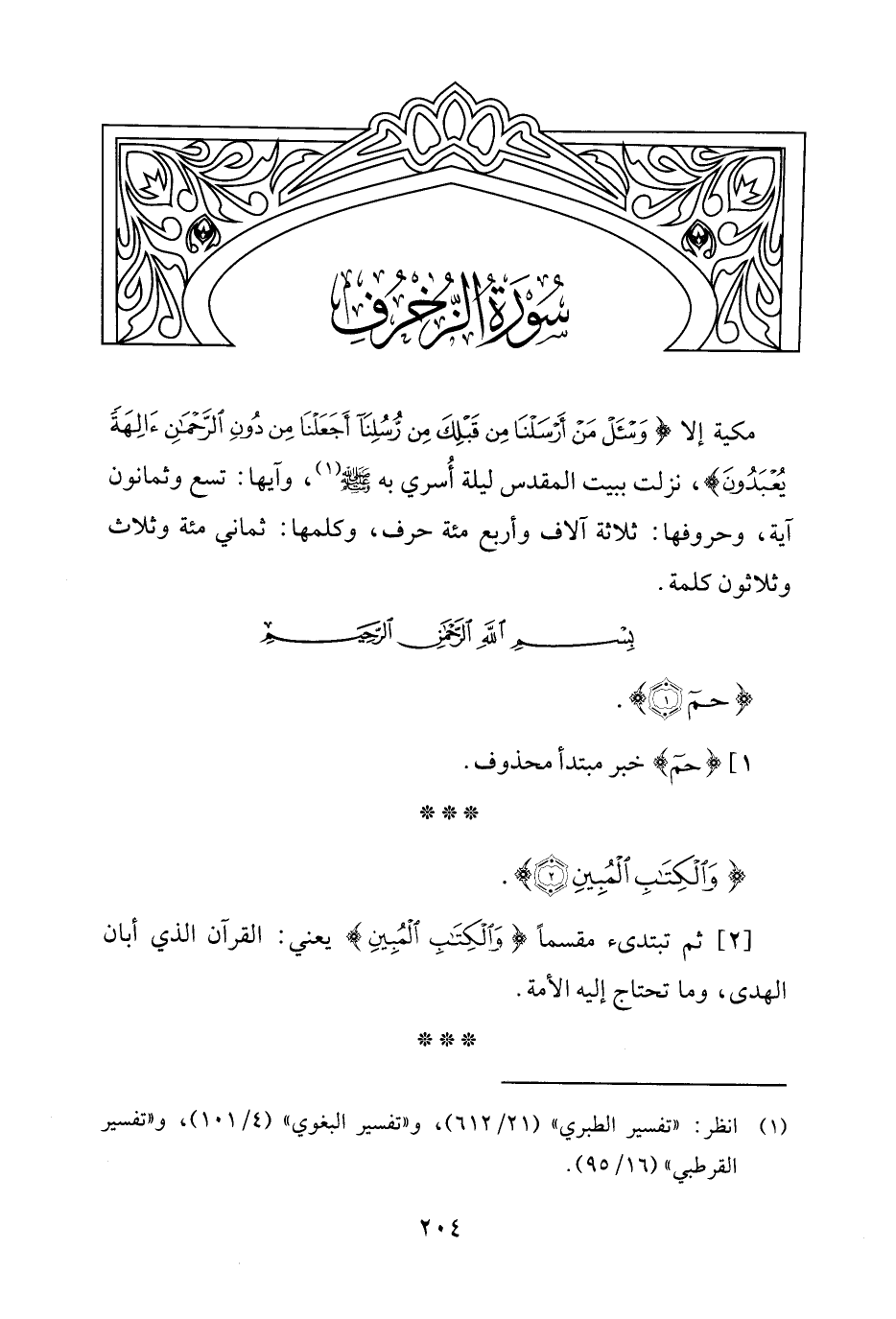 مكية إلا {وَاسْأَلْ مَنْ أَرْسَلْنَا مِنْ قَبْلِكَ مِنْ رُسُلِنَا أَجَعَلْنَا مِنْ دُونِ الرَّحْمَنِ آلِهَةً يُعْبَدُونَ}، نزلت ببيت المقدس ليلة أُسري به - صلى الله عليه وسلم - (¬1)، وآيها: تسع وثمانون آية، وحروفها: ثلاثة آلاف وأربع مئة حرف، وكلمها: ثماني مئة وثلاث وثلاثون كلمة.