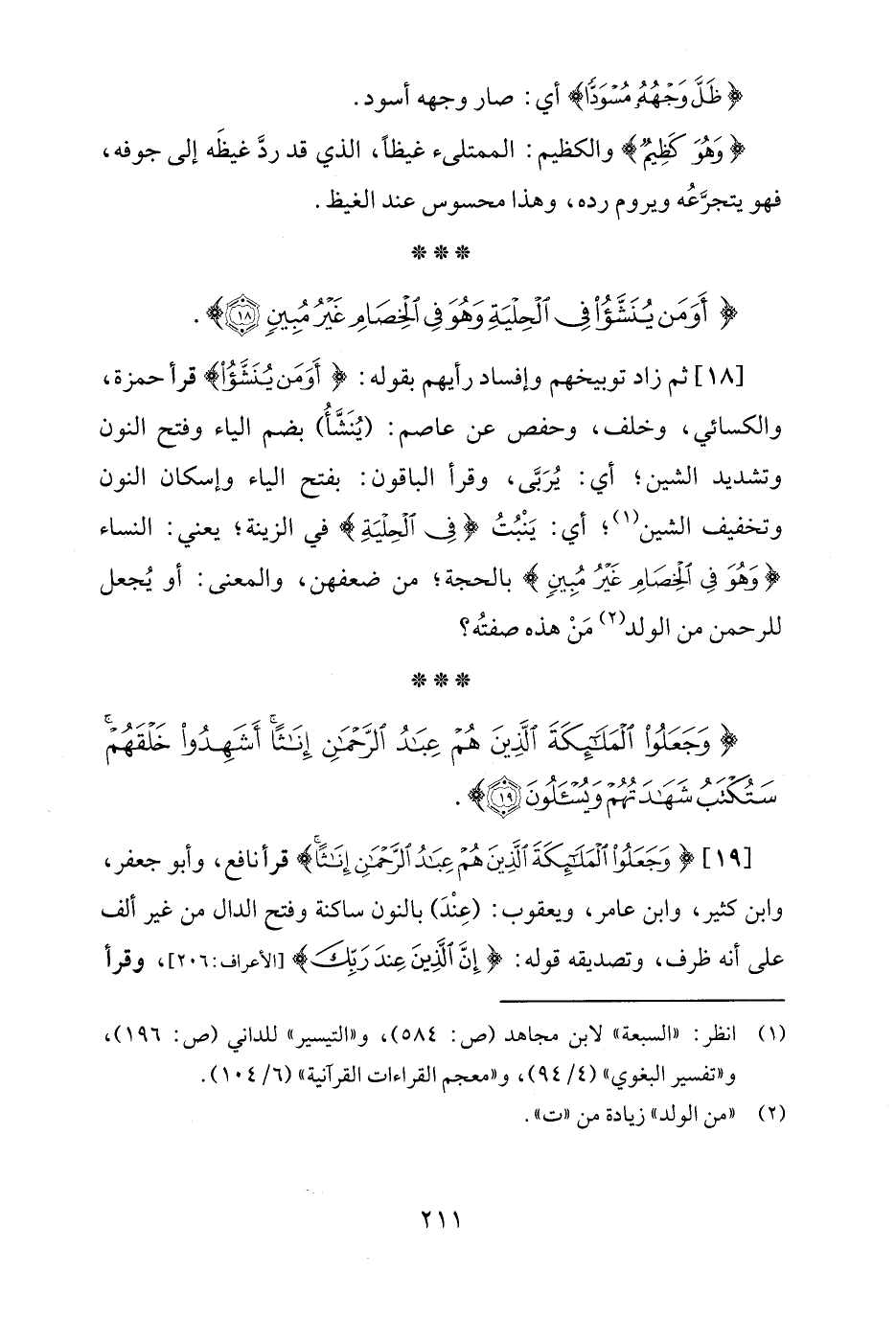 [18] ثم زاد توبيخهم وإفساد رأيهم بقوله: {أَوَمَنْ يُنَشَّأُ} قرأ حمزة، والكسائي، وخلف، وحفص عن عاصم: (يُنَشَّأُ) بضم الياء وفتح النون وتشديد الشين؛ أي: يُرَبَّى، وقرأ الباقون: بفتح الياء وإسكان النون وتخفيف الشين (¬1)؛ أي: يَنْبُتُ {فِي الْحِلْيَةِ} في الزينة؛ يعني: النساء {وَهُوَ فِي الْخِصَامِ غَيْرُ مُبِينٍ} بالحجة؛ من ضعفهن، والمعنى: أو يُجعل للرحمن من الولد (¬2) مَنْ هذه صفتُه؟