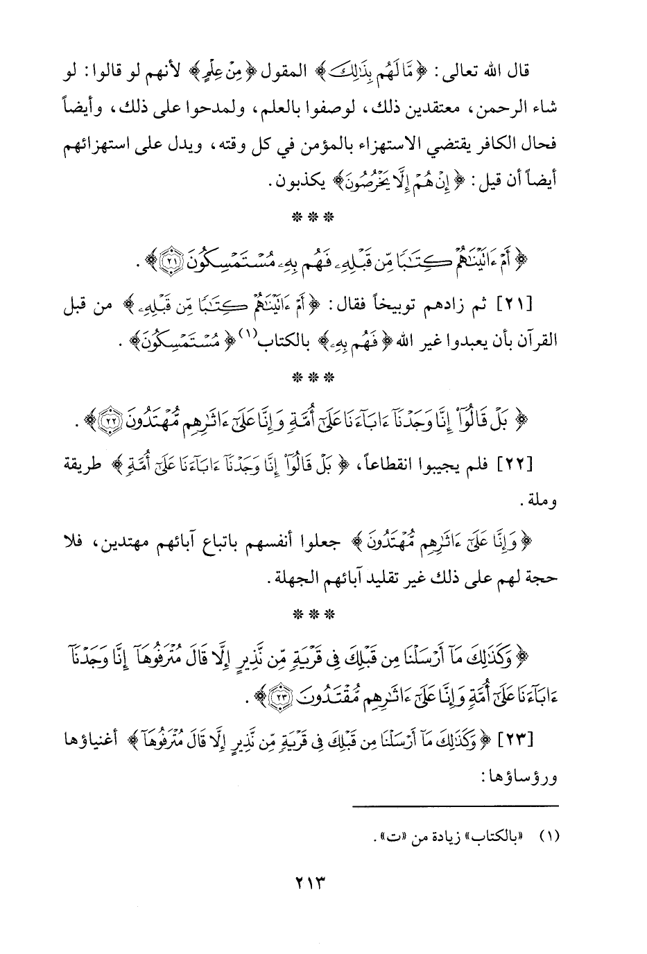 {وَكَذَلِكَ مَا أَرْسَلْنَا مِنْ قَبْلِكَ فِي قَرْيَةٍ مِنْ نَذِيرٍ إِلَّا قَالَ مُتْرَفُوهَا إِنَّا وَجَدْنَا آبَاءَنَا عَلَى أُمَّةٍ وَإِنَّا عَلَى آثَارِهِمْ مُقْتَدُونَ (23)}.