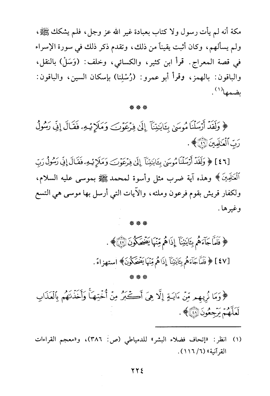 مكة أنه لم يأت رسول ولا كتاب بعبادة غير الله عز وجل، فلم يشكك - صلى الله عليه وسلم -، ولم يسألهم، وكان أثبت يقينًا من ذلك، وتقدم ذكر ذلك في سورة الإسراء في قصة المعراج. قرأ ابن كثير، والكسائي، وخلف: (وَسَلْ) بالنقل، والباقون: بالهمز، وقرأ أبو عمرو: (رُسْلِنا) بإسكان السين، والباقون: بضمها (¬1).