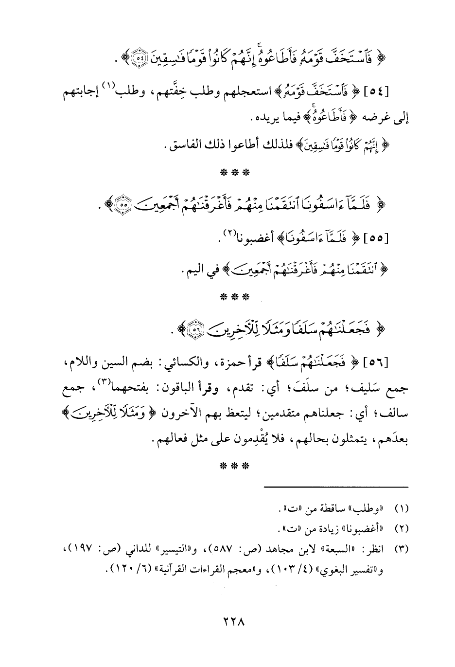 [56] {فَجَعَلْنَاهُمْ سَلَفًا} قرأ حمزة، والكسائي: بضم السين واللام، جمع سَليف؛ من سلَفَ؛ أي: تقدم، وقرأ الباقون: بفتحهما (¬3)، جمع سالف؛ أي: جعلناهم متقدمين؛ ليتعظ بهم الآخرون {وَمَثَلًا لِلْآخِرِينَ} بعدَهم، يتمثلون بحالهم، فلا يُقْدِمون على مثل فعالهم.