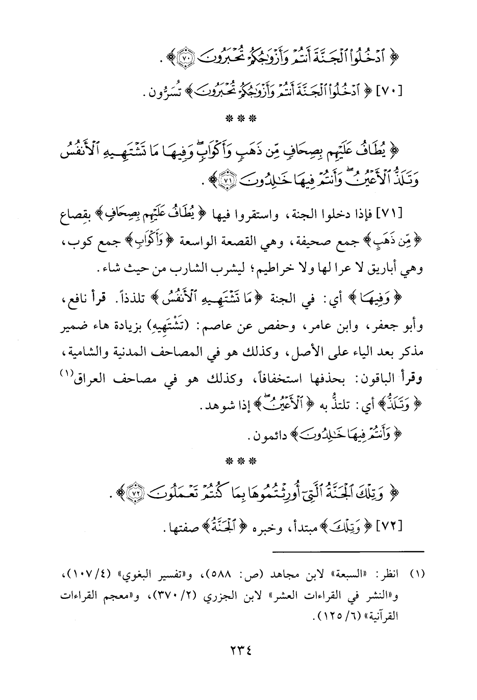 {وَفِيهَا} أي: في الجنة {مَا تَشْتَهِيهِ الْأَنْفُسُ} تلذذًا. قرأ نافع، وأبو جعفر، وابن عامر، وحفص عن عاصم: (تشتَهِيهِ) بزيادة هاء ضمير مذكر بعد الياء على الأصل، وكذلك هو في المصاحف المدنية والشامية، وقرأ الباقون: بحذفها استخفافًا، وكذلك هو في مصاحف العراق (¬1) {وَتَلَذُّ} أي: تلتذُّ به {الْأَعْيُنُ} إذا شوهد.