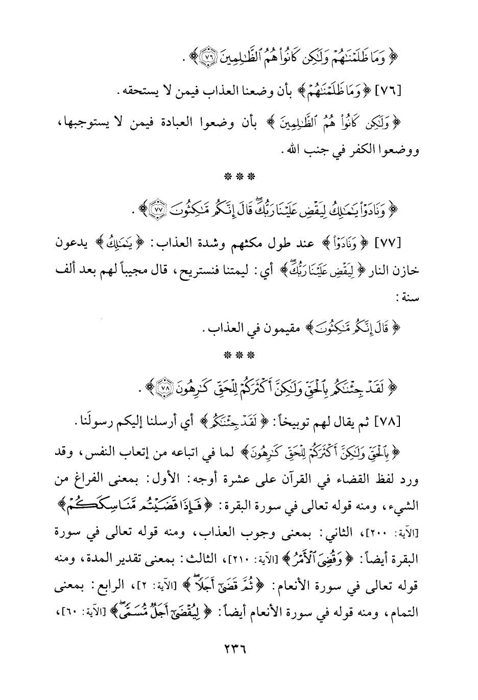 {بِالْحَقِّ وَلَكِنَّ أَكْثَرَكُمْ لِلْحَقِّ كَارِهُونَ} لما في اتباعه من إتعاب النفس، وقد ورد لفظ القضاء في القرآن على عشرة أوجه: الأول: بمعنى الفراغ من الشيء، ومنه قوله تعالى في سورة البقرة: {فَإِذَا قَضَيْتُمْ مَنَاسِكَكُمْ} [الآية: 200]، الثاني: بمعنى وجوب العذاب، ومنه قوله تعالى في سورة البقرة أيضًا: {وَقُضِيَ الْأَمْرُ} [الآية: 210]، الثالث: بمعنى تقدير المدة، ومنه قوله تعالى في سورة الأنعام: {ثُمَّ قَضَى أَجَلًا} [الآية: 2]، الرابع: بمعنى التمام، ومنه قوله في سورة الأنعام أيضًا: {لِيُقْضَى أَجَلٌ مُسَمًّى} [الآية: 60]،