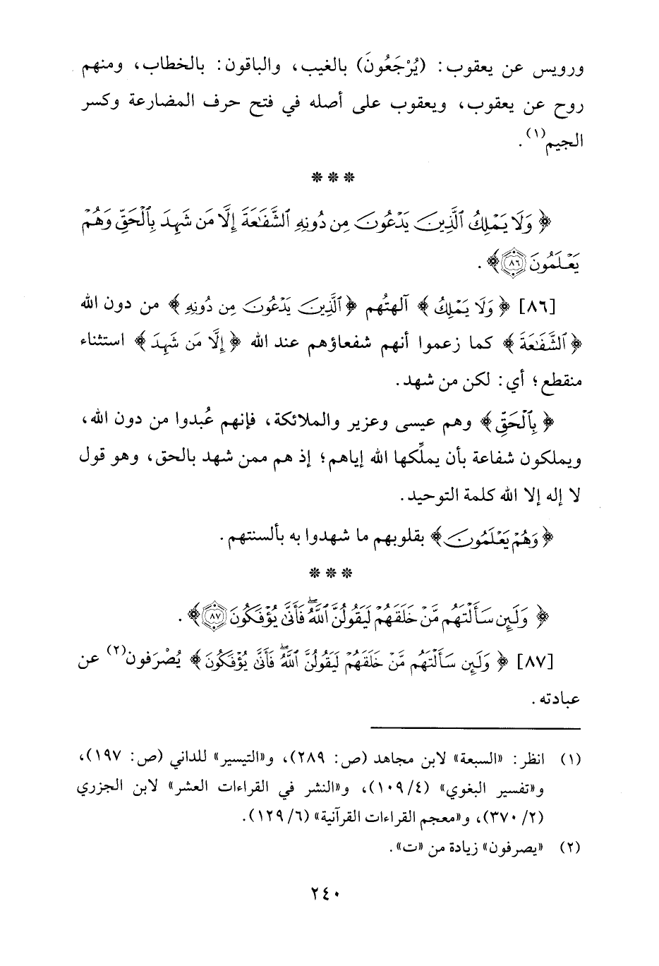 (¬1) انظر: "السبعة" لابن مجاهد (ص: 289)، و"التيسير" للداني (ص:197)، و"تفسير البغوي" (4/ 109)، و "النشر في القراءات العشر" لابن الجزري (2/ 370)، و"معجم القراءات القرآنية" (6/ 129).