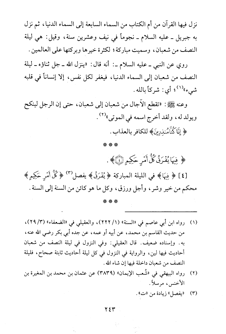 [4] {فِيهَا} في الليلة المباركة {يُفْرَقُ} يفصل (¬3) {كُلُّ أَمْرٍ حَكِيمٍ} محكم من خير وشر، وأجل ورزق، وكل ما هو كائن من السنة إلى السنة.