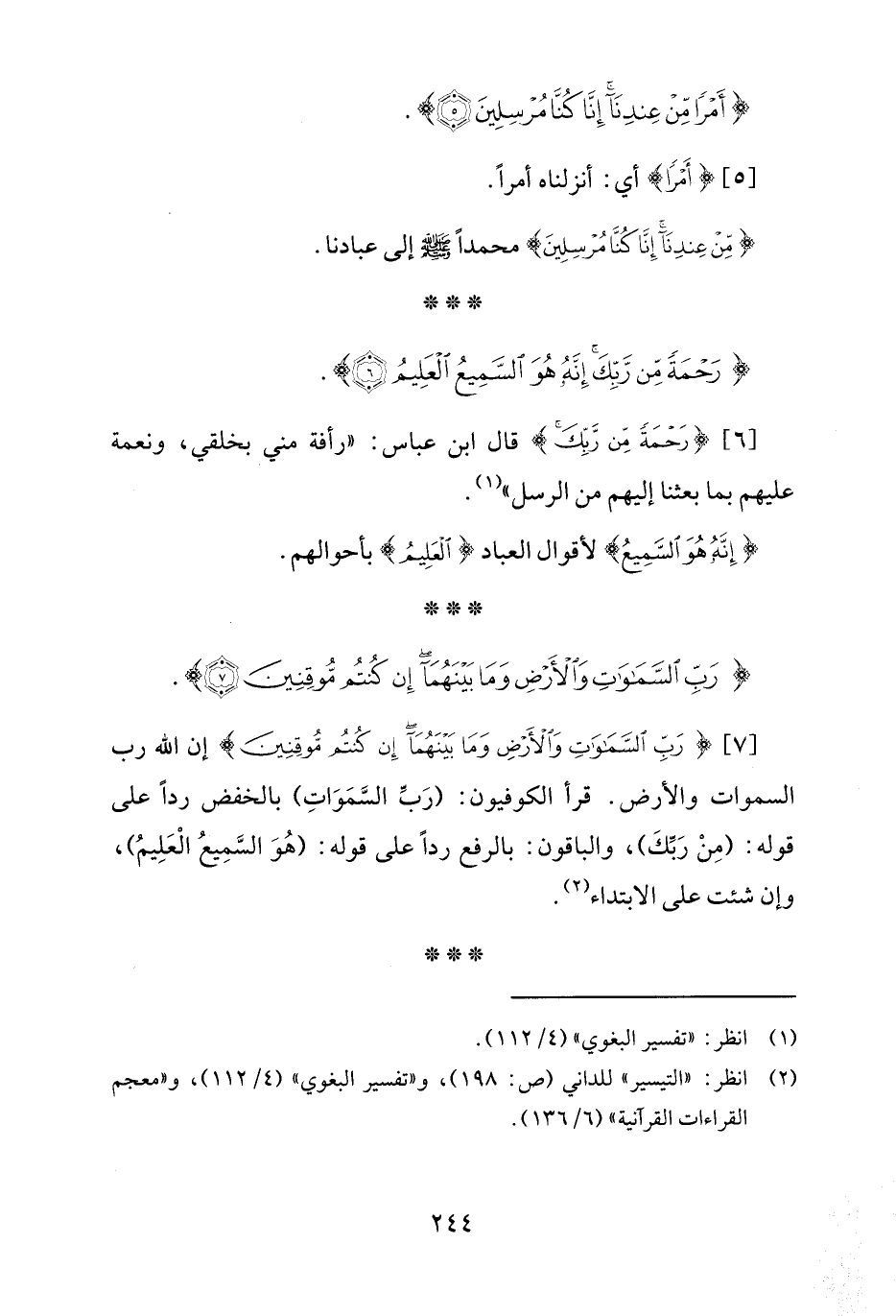[7] {رَبِّ السَّمَاوَاتِ وَالْأَرْضِ وَمَا بَيْنَهُمَا إِنْ كُنْتُمْ مُوقِنِينَ} إن الله رب السموات والأرض. قرأ الكوفيون: (رَبِّ السَّمَوَاتِ) بالخفض ردًّا على قوله: (مِنْ رَبِّكَ)، والباقون: بالرفع ردًّا على قوله: (هُوَ السَّمِيعُ الْعَلِيمُ)، وإن شئت على الابتداء (¬2).