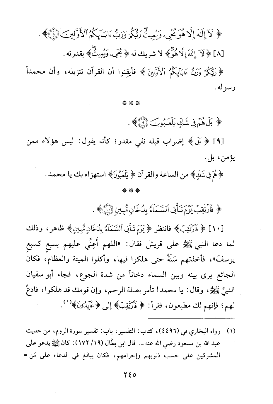 [10] {فَارْتَقِبْ} فانتظر {يَوْمَ تَأْتِي السَّمَاءُ بِدُخَانٍ مُبِينٍ} ظاهر، وذلك لما دعا النبي - صلى الله عليه وسلم - على قريش فقال: "اللهم أَعِنِّي عليهم بسبعٍ كسبعِ يوسفَ"، فأخذتهم سَنَةٌ حتى هلكوا فيها، وأكلوا الميتة والعظام، فكان الجائع يرى بينه وبين السماء دخانًا من شدة الجوع، فجاء أبو سفيان النبيَّ - صلى الله عليه وسلم -، وقال: يا محمد! تأمر بصلة الرحم، وإن قومك قد هلكوا، فادعُ لهم؛ فإنهم لك مطيعون، فقرأ: {فَارْتَقِبْ} إلى {عَائِدُونَ} (¬1).