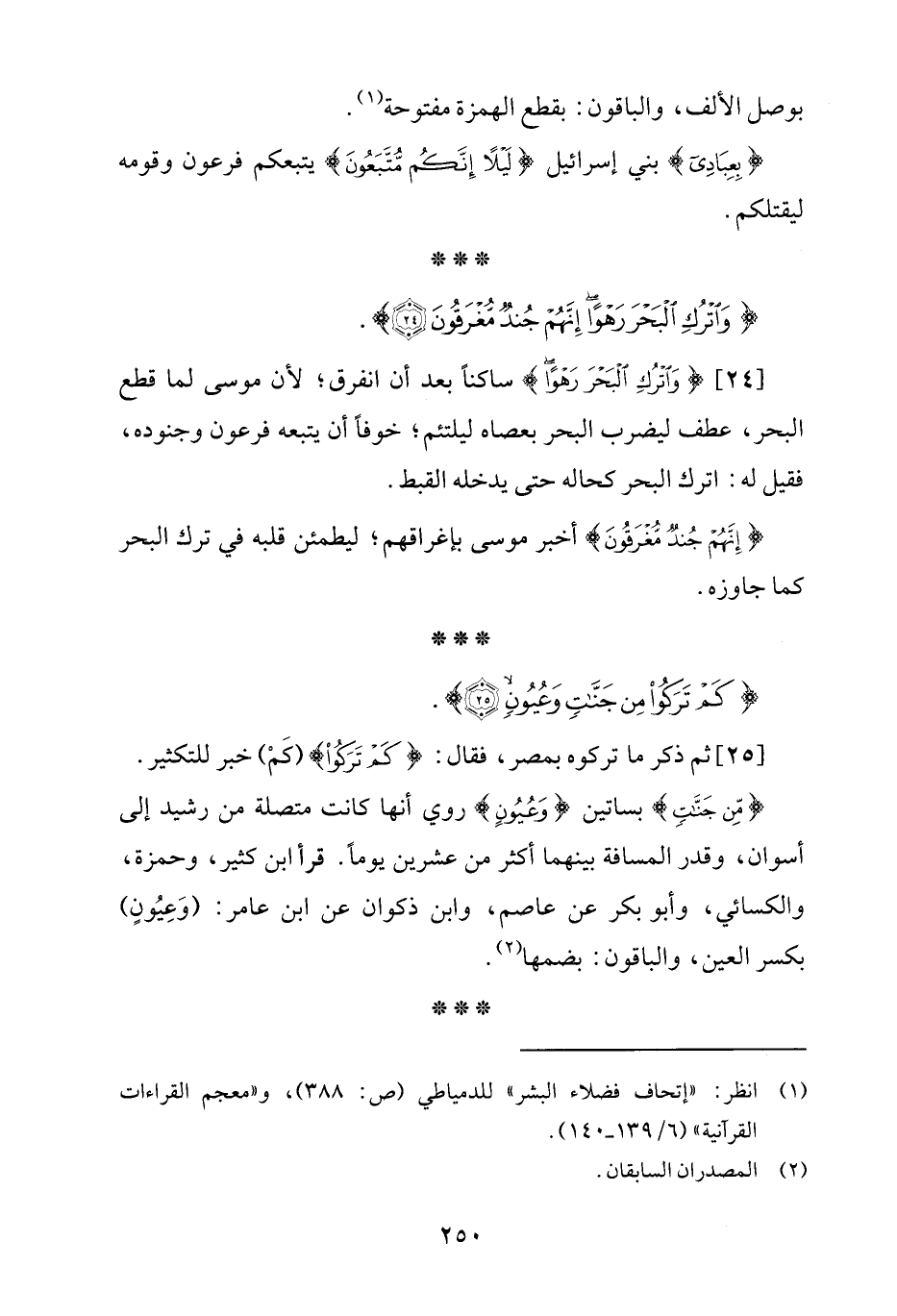 [24] {وَاتْرُكِ الْبَحْرَ رَهْوًا} ساكنًا بعد أن انفرق؛ لأن موسى لما قطع البحر، عطف ليضرب البحر بعصاه ليلتئم؛ خوفًا أن يتبعه فرعون وجنوده، فقيل له: اترك البحر كحاله حتى يدخله القبط.