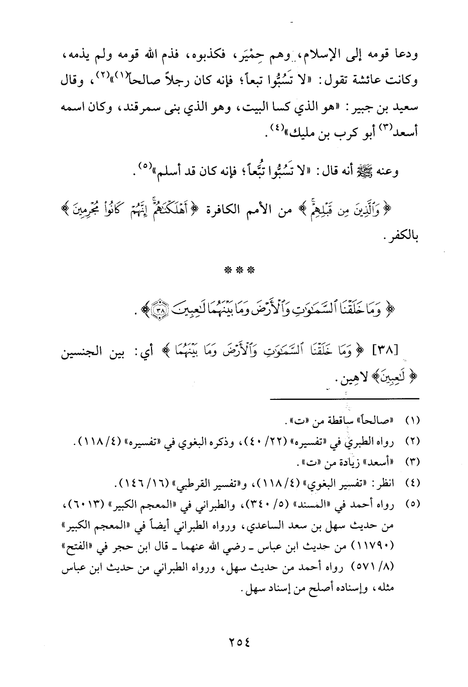 وعنه - صلى الله عليه وسلم - أنه قال: "لا تسُبُّوا تبُّعًا؛ فإنه كان قد أسلم" (¬5).