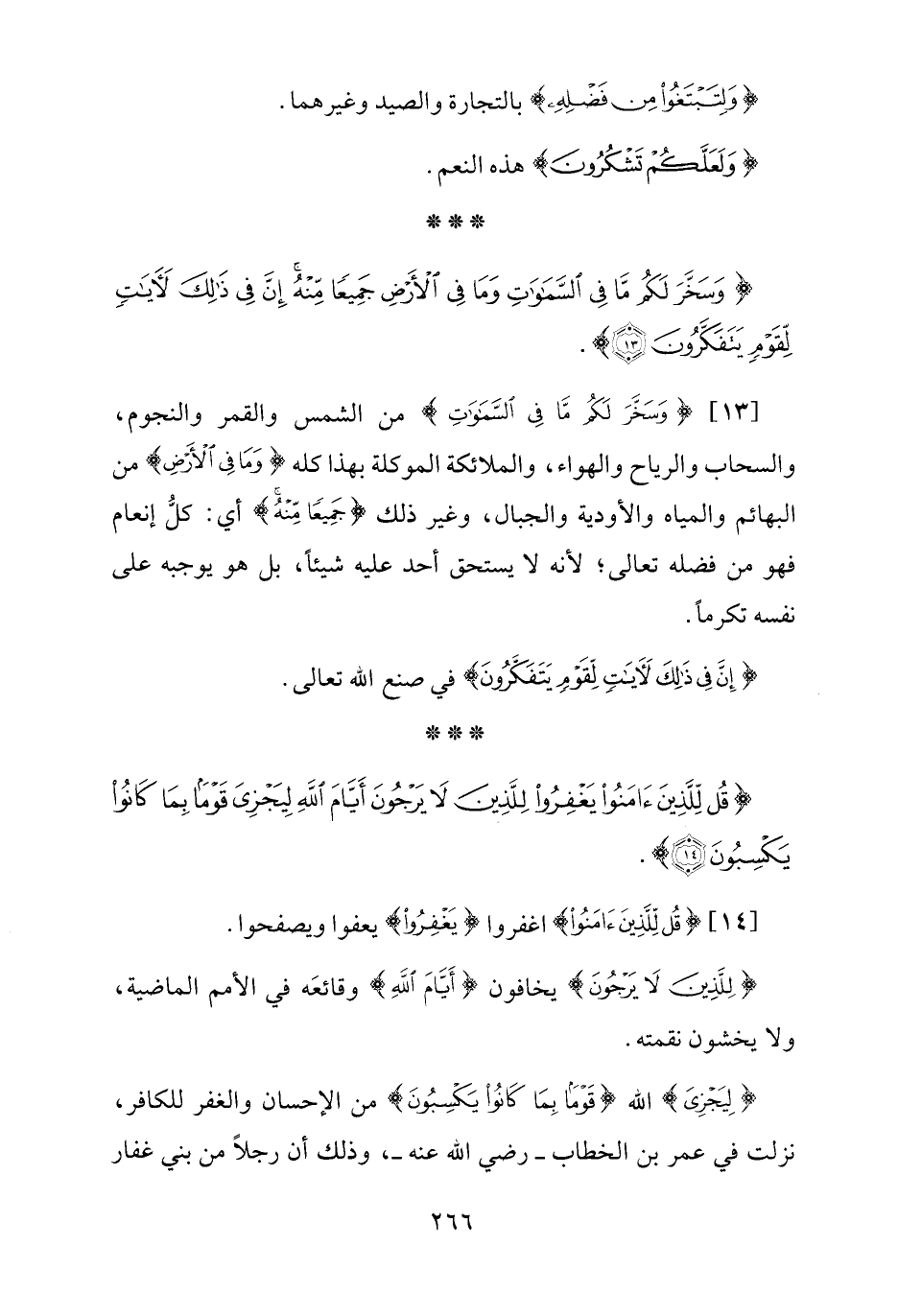 [13] {وَسَخَّرَ لَكُمْ مَا فِي السَّمَاوَاتِ} من الشمس والقمر والنجوم، والسحاب والرياح والهواء، والملائكة الموكلة بهذا كله {وَمَا فِي الْأَرْضِ} من البهائم والمياه والأودية والجبال، وغير ذلك {جَمِيعًا مِنْهُ} أي: كلُّ إنعام فهو من فضله تعالى؛ لأنه لا يستحق أحد عليه شيئًا، بل هو يوجبه على نفسه تكرمًا.