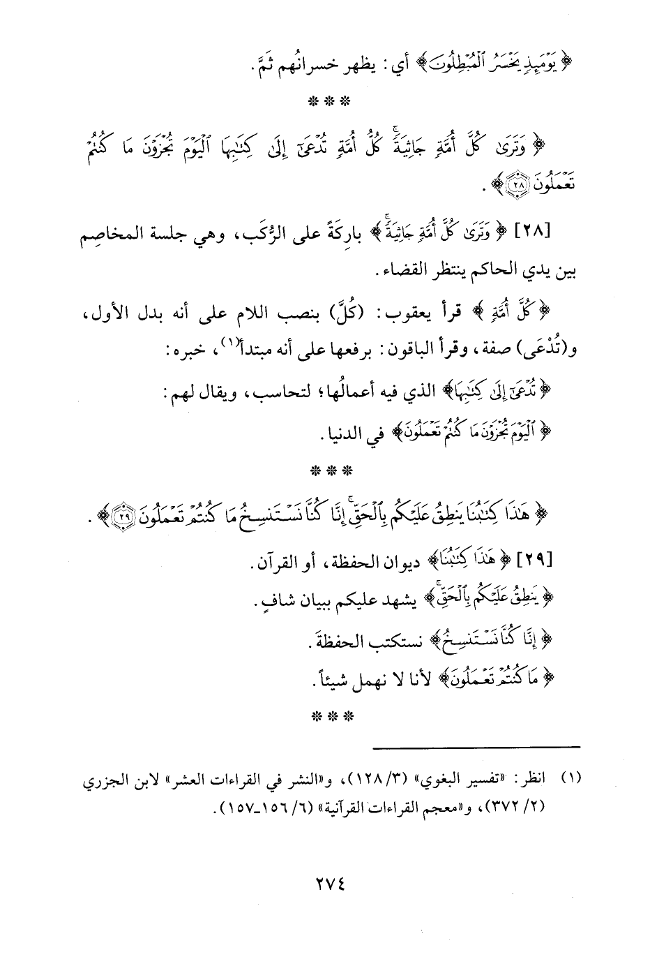 [28] {وَتَرَى كُلَّ أُمَّةٍ جَاثِيَةً} بارِكَةً على الرُّكَب، وهي جلسة المخاصِم بين يدي الحاكم ينتظر القضاء.