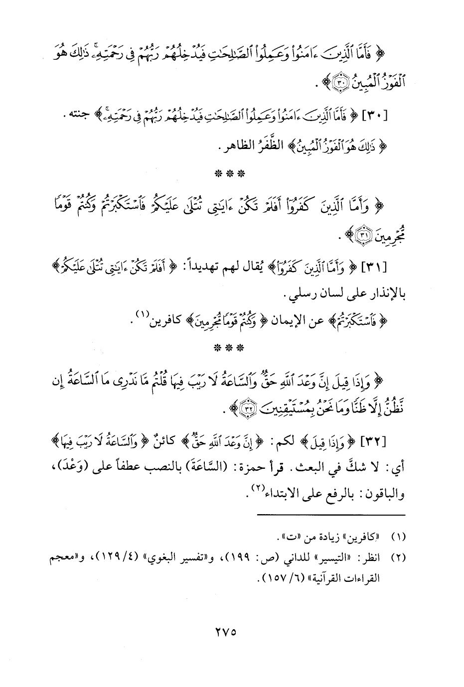 [32] {وَإِذَا قِيلَ} لكم: {إِنَّ وَعْدَ اللَّهِ حَقٌّ} كائنٌ {وَالسَّاعَةُ لَا رَيْبَ فِيهَا} أي: لا شكَّ في البعث. قرأ حمزة: (السَّاعَةَ) بالنصب عطفًا على (وَعْدَ)، والباقون: بالرفع على الابتداء (¬2).