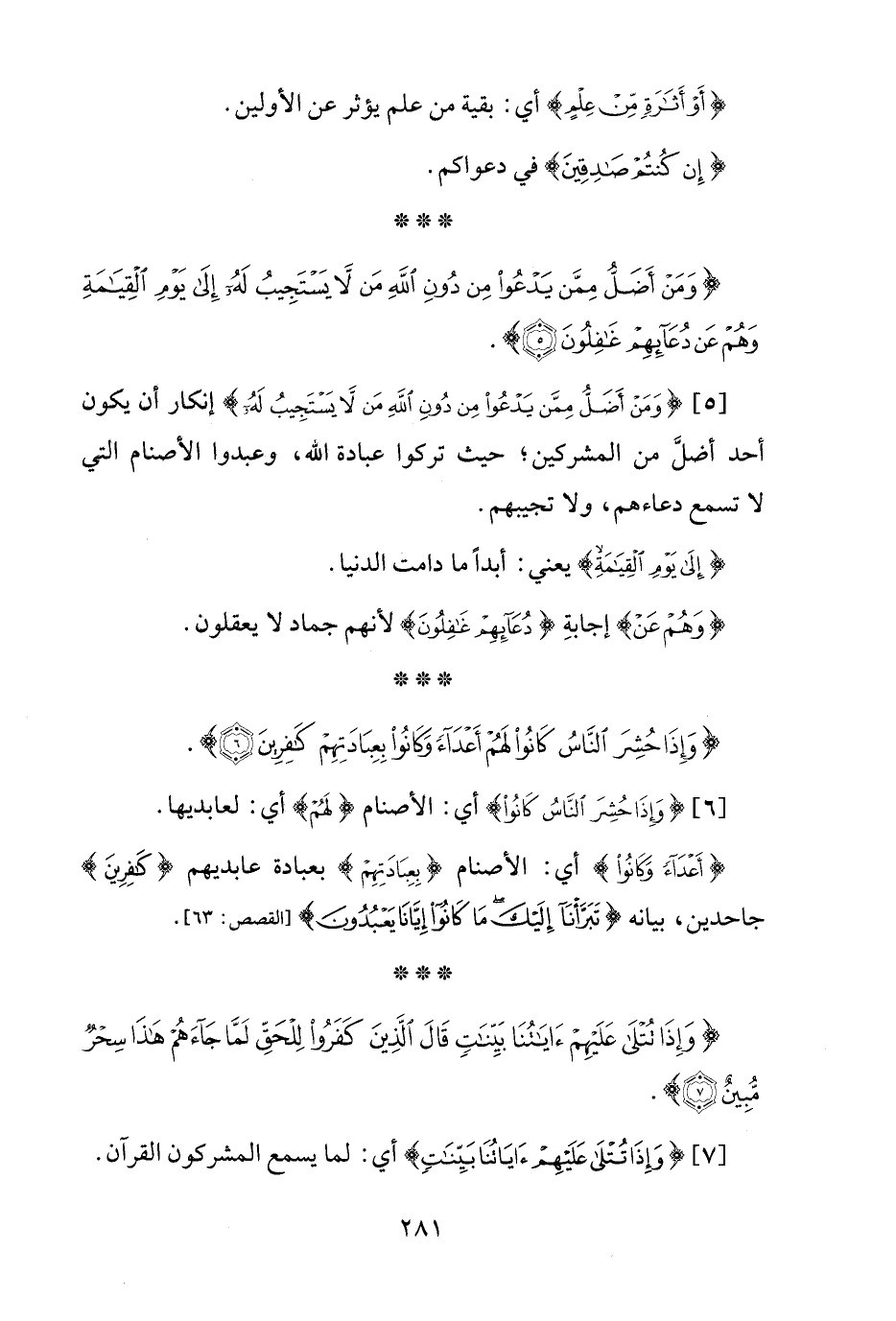 [5] {وَمَنْ أَضَلُّ مِمَّنْ يَدْعُو مِنْ دُونِ اللَّهِ مَنْ لَا يَسْتَجِيبُ لَهُ} إنكار أن يكون أحد أضلَّ من المشركين؛ حيث تركوا عبادة الله، وعبدوا الأصنام التي لا تسمع دعاءهم، ولا تجيبهم.