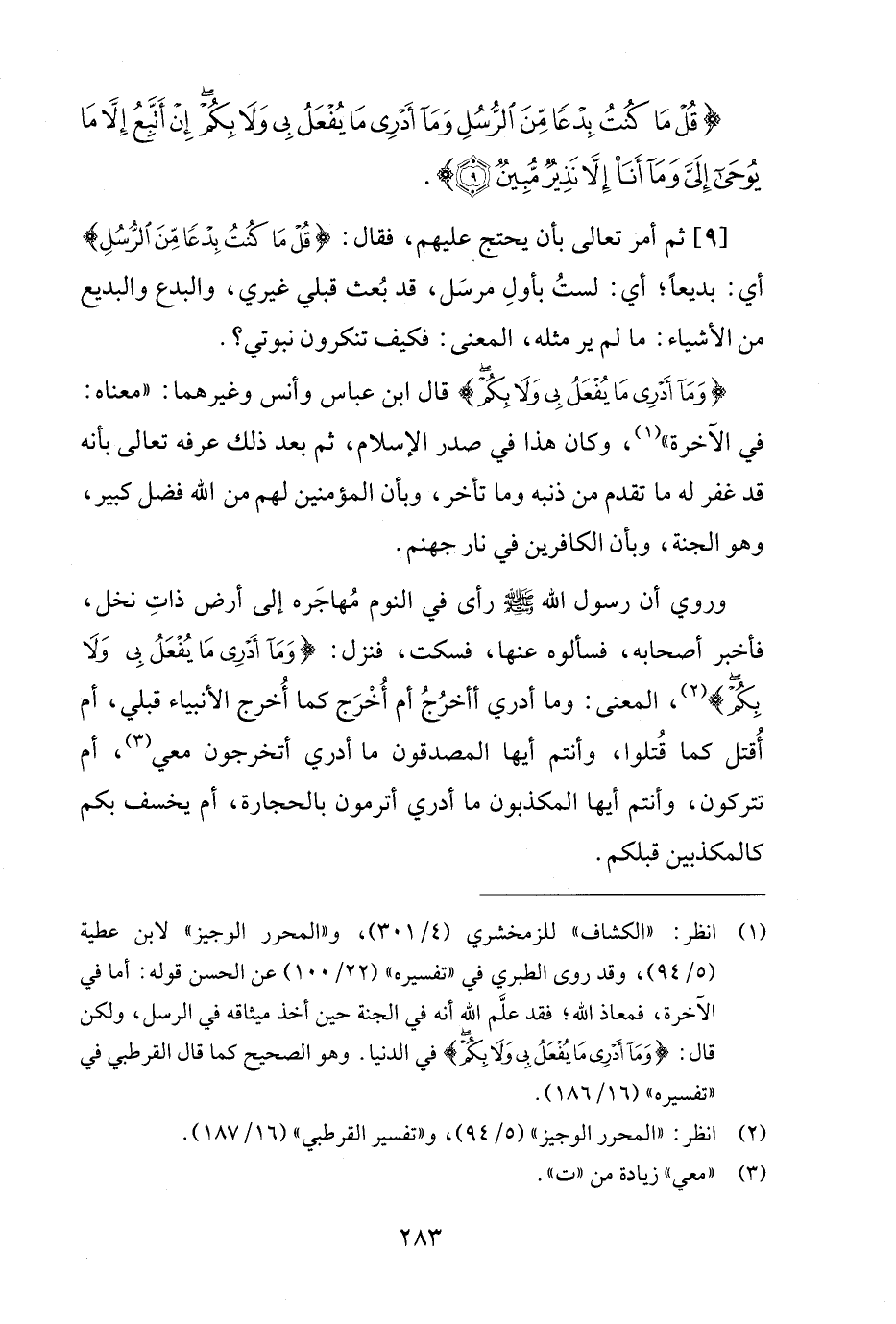 (¬1) انظر: "الكشاف" للزمخشري (4/ 301)، و"المحرر الوجيز" لابن عطية (5/ 94)، وقد روى الطبري في "تفسيره" (22/ 100) عن الحسن قوله: أما في الآخرة، فمعاذ الله؛ فقد علَّم الله أنه في الجنة حين أخذ ميثاقه في الرسل، ولكن قال: {وَمَا أَدْرِي مَا يُفْعَلُ بِي وَلَا بِكُمْ} في الدنيا. وهو الصحيح كما قال القرطبي في "تفسيره" (16/ 186).