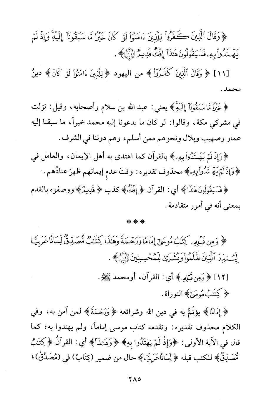 {خَيْرًا مَا سَبَقُونَا إِلَيْهِ} يعني: عبد الله بن سلام وأصحابه، وقيل: نزلت في مشركي مكّة، وقالوا: لو كان ما يدعونا إليه محمّد خيرًا، ما سبقنا إليه عمار وصهيب وبلال ونحوهم ممّن أسلم، وهم دوننا في الشرف.