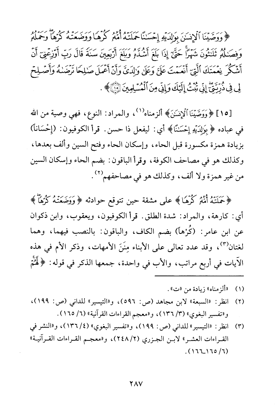 [15] {وَوَصَّيْنَا الْإِنْسَانَ} ألزمناه (¬1)، والمراد: النوع، فهي وصية من الله في عباده {بِوَالِدَيْهِ إِحْسَانًا} أي: ليفعل ذا حسن. قرأ الكوفيون: (إِحْسَانًا) بزيادة همزة مكسورة قبل الحاء، وإسكان الحاء وفتح السين وألف بعدها، وكذلك هو في مصاحف الكوفة، وقرأ الباقون: بضم الحاء وإسكان السين من غير همزة ولا ألف، وكذلك هو في مصاحفهم (¬2).