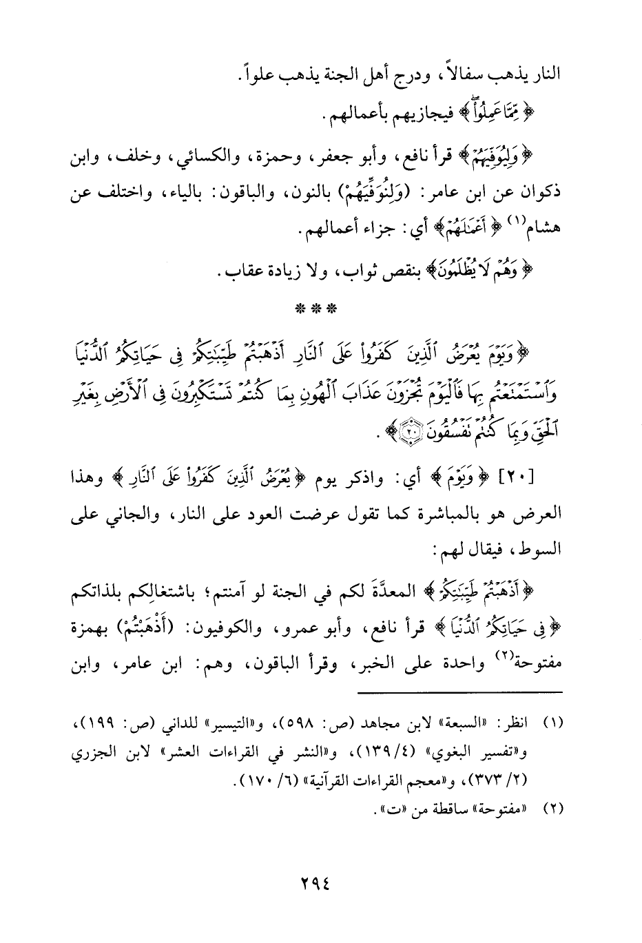 {وَيَوْمَ يُعْرَضُ الَّذِينَ كَفَرُوا عَلَى النَّارِ أَذْهَبْتُمْ طَيِّبَاتِكُمْ فِي حَيَاتِكُمُ الدُّنْيَا وَاسْتَمْتَعْتُمْ بِهَا فَالْيَوْمَ تُجْزَوْنَ عَذَابَ الْهُونِ بِمَا كُنْتُمْ تَسْتَكْبِرُونَ فِي الْأَرْضِ بِغَيْرِ الْحَقِّ وَبِمَا كُنْتُمْ تَفْسُقُونَ (20)}.