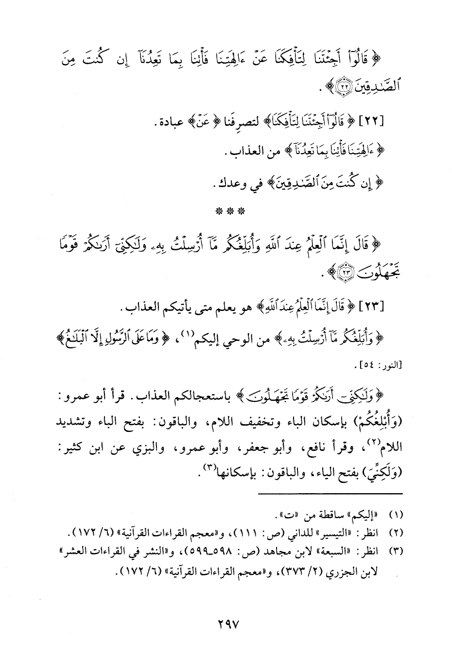 {وَلَكِنِّي أَرَاكُمْ قَوْمًا تَجْهَلُونَ} باستعجالكم العذاب. قرأ أبو عمرو: (وَأبلِغُكُمْ) بإسكان الباء وتخفيف اللام، والباقون: بفتح الباء وتشديد اللام (¬2)، وقرأ نافع، وأبو جعفر، وأبو عموو، والبزي عن ابن كثير؛ (وَلَكِنِّيَ) بفتح الياء، والبادون: بإسكانها (¬3).