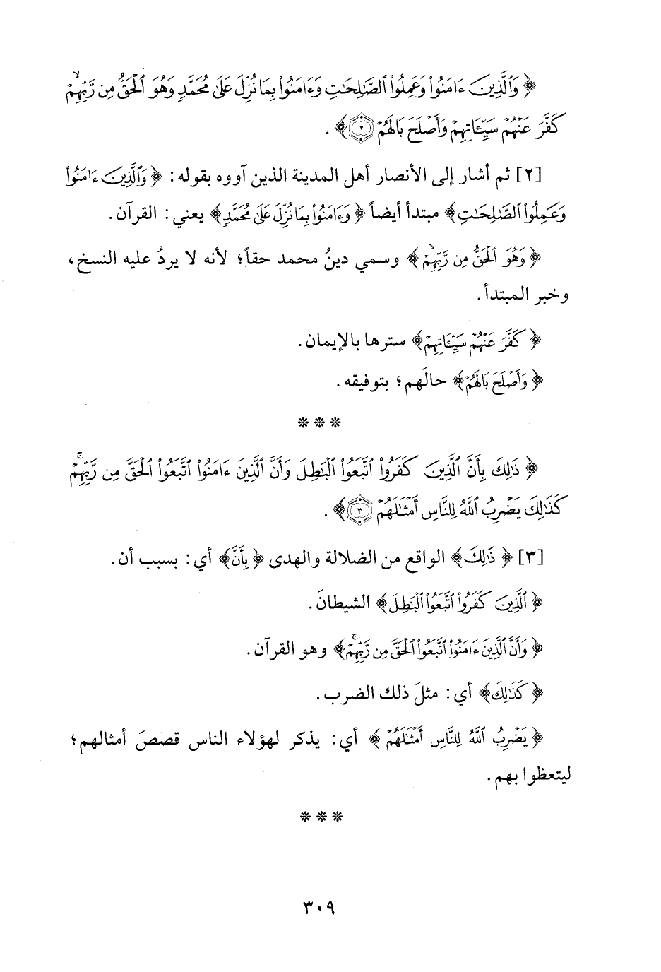 [2] ثمّ أشار إلى الأنصار أهل المدينة الذين آووه بقوله: {وَالَّذِينَ آمَنُوا وَعَمِلُوا الصَّالِحَاتِ} مبتدأ أيضًا {وَآمَنُوا بِمَا نُزِّلَ عَلَى مُحَمَّدٍ} يعني: القرآن.
