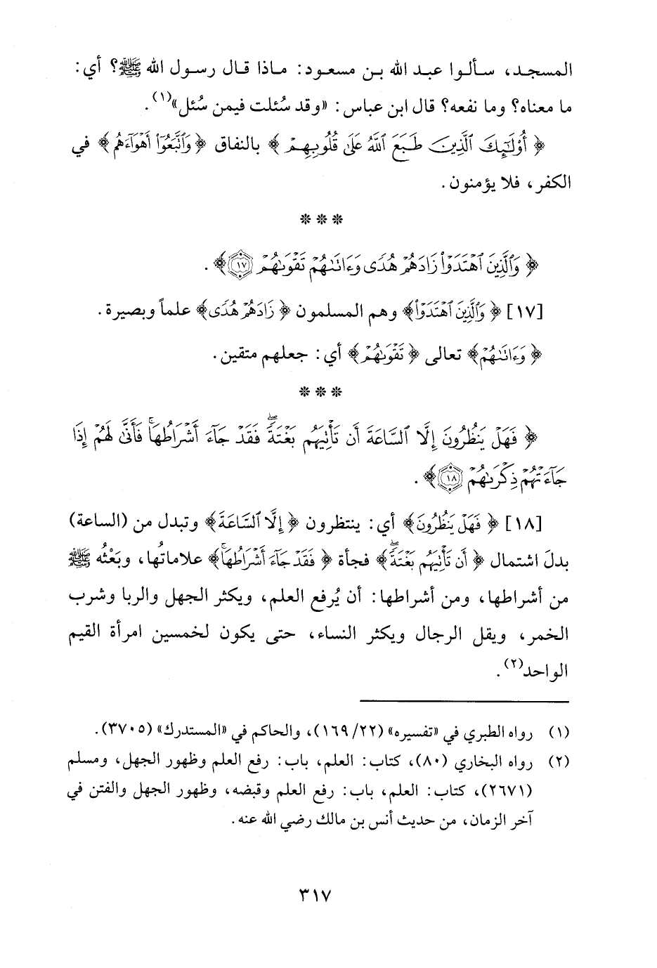 [18] {فَهَلْ يَنْظُرُونَ} أي: ينتظرون {إِلَّا السَّاعَةَ} وتبدل من (السّاعة) بدلَ اشتمال {أَنْ تَأْتِيَهُمْ بَغْتَةً} فجأة {فَقَدْ جَاءَ أَشْرَاطُهَا} علاماتُها، وبَعْثُه - صلى الله عليه وسلم - من أشراطها، ومن أشراطها: أن يُرفع العلم، ويكثر الجهل والربا وشرب الخمْرِ، ويقل الرجال ويكثر النِّساء، حتّى يكون لخمسين امرأة القيم الواحد (¬2).