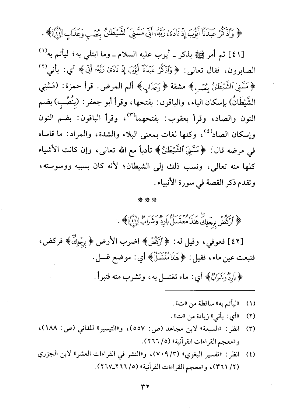 [41] ثم أمر - صلى الله عليه وسلم - بذكر - أيوب عليه السلام - وما ابتلي به؛ ليأتم به (¬1) الصابرون، فقال تعالى: {وَاذْكُرْ عَبْدَنَا أَيُّوبَ إِذْ نَادَى رَبَّهُ أَنِّي} أي: بأني (¬2) {مَسَّنِيَ الشَّيْطَانُ بِنُصْبٍ} مشقة {وَعَذَابٍ} ألم المرض. قرأ حمزة: (مَسَّنِي الشَّيْطَانُ) بإسكان الياء، والباقون: بفتحها، وقرأ أبو جعفر: (بِنُصُبٍ) بضم النون والصاد، وقرأ يعقوب: بفتحهما (¬3)، وقرأ الباقون: بضم النون وإسكان الصاد (¬4)، وكلها لغات بمعنى البلاء والشدة، والمراد: ما قاساه في مرضه قال: {مَسَّنِيَ الشَّيْطَانُ} تأدبًا مع الله تعالى، وإن كانت الأشياء كلها منه تعالى، ونسب ذلك إلى الشيطان؛ لأنه كان بسببه ووسوسته، وتقدم ذكر القصة في سورة الأنبياء.