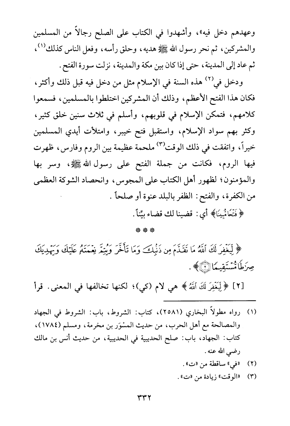 {لِيَغْفِرَ لَكَ اللَّهُ مَا تَقَدَّمَ مِنْ ذَنْبِكَ وَمَا تَأَخَّرَ وَيُتِمَّ نِعْمَتَهُ عَلَيْكَ وَيَهْدِيَكَ صِرَاطًا مُسْتَقِيمًا (2)}.