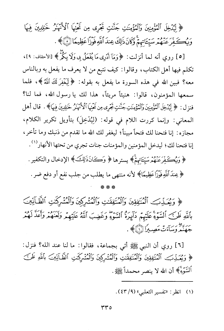 [6] روي أن النبي - صلى الله عليه وسلم - أتي بجماعة، فقالوا: ما لنا عند الله؟ فنزل: {وَيُعَذِّبَ الْمُنَافِقِينَ وَالْمُنَافِقَاتِ وَالْمُشْرِكِينَ وَالْمُشْرِكَاتِ الظَّانِّينَ بِاللَّهِ ظَنَّ السَّوْءِ} أن الله لا ينصر محمدًا - صلى الله عليه وسلم -.