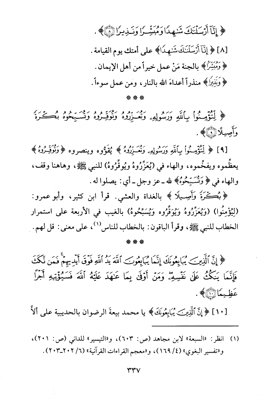 [9] {لِتُؤْمِنُوا بِاللَّهِ وَرَسُولِهِ وَتُعَزِّرُوهُ} يُقَوُّوه وينصروه {وَتُوَقِّرُوهُ} يعظِّموه ويفخِّموه، والهاء في (يُعَزِّرُوهُ ويُوقِّرُوهُ) للنبي - صلى الله عليه وسلم -، وهاهنا وقف، والهاء في {وَتُسَبِّحُوهُ} لله -عز وجل- أي: يصلوا له.