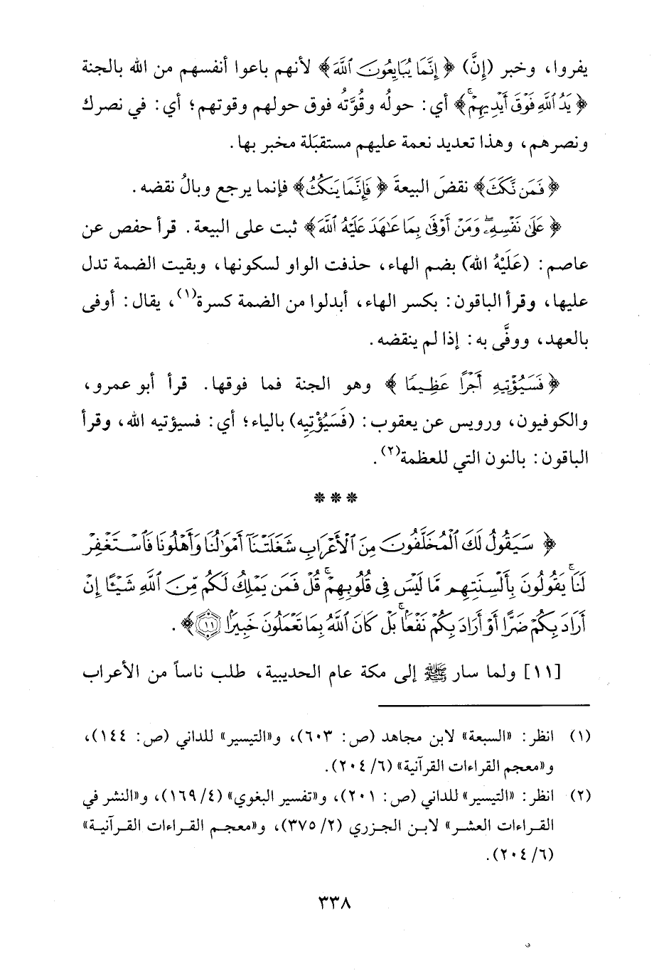 {عَلَى نَفْسِهِ وَمَنْ أَوْفَى بِمَا عَاهَدَ عَلَيْهُ اللَّهَ} ثبت على البيعة. قرأ حفص عن عاصم: (عَلَيْهُ الله) بضم الهاء، حذفت الواو لسكونها، وبقيت الضمة تدل عليها، وقرأ الباقون: بكسر الهاء، أبدلوا من الضمة كسرة (¬1)، يقال: أوفى بالعهد، ووفَّى به: إذا لم ينقضه.