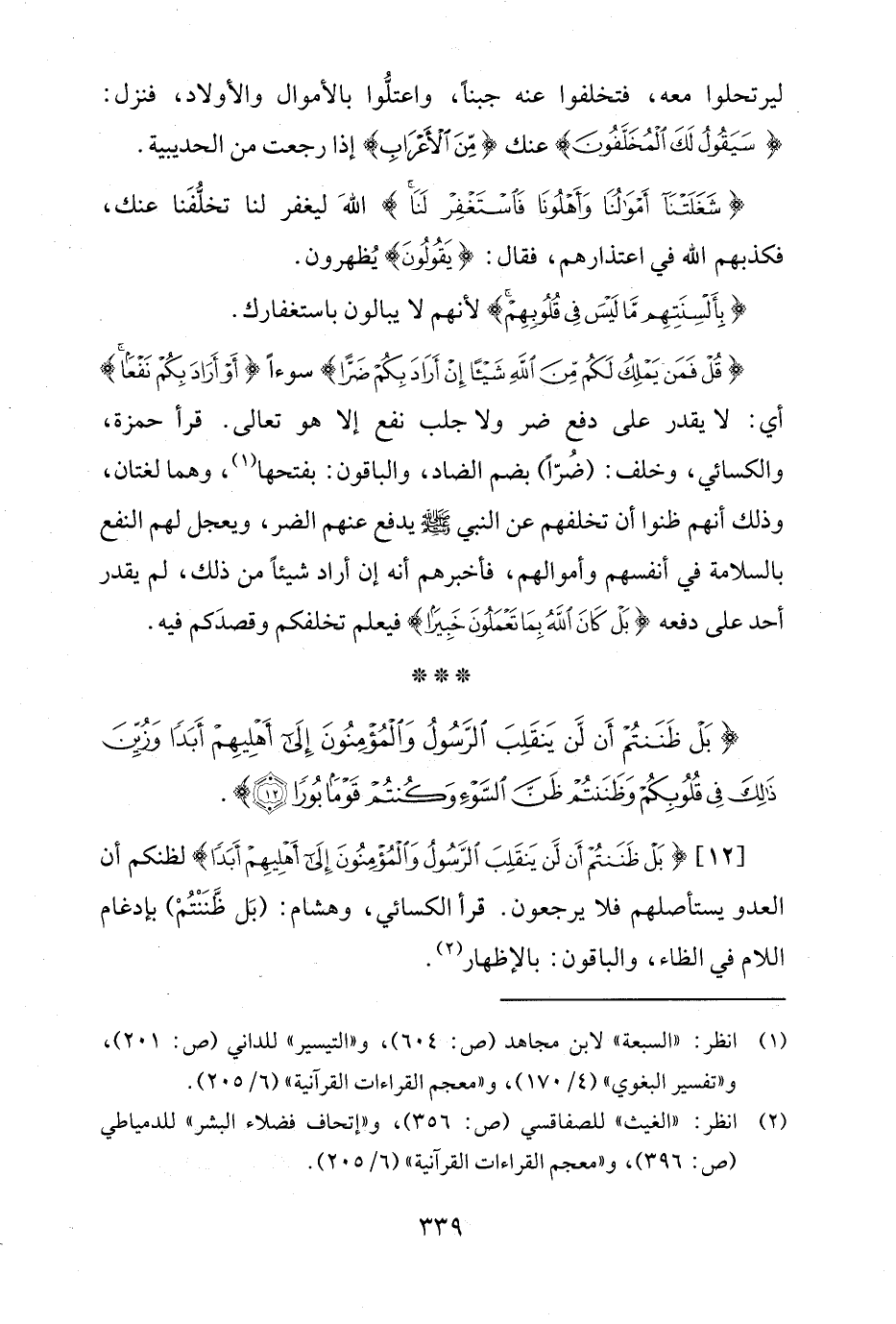 {بَلْ ظَنَنْتُمْ أَنْ لَنْ يَنْقَلِبَ الرَّسُولُ وَالْمُؤْمِنُونَ إِلَى أَهْلِيهِمْ أَبَدًا وَزُيِّنَ ذَلِكَ فِي قُلُوبِكُمْ وَظَنَنْتُمْ ظَنَّ السَّوْءِ وَكُنْتُمْ قَوْمًا بُورًا (12)}.