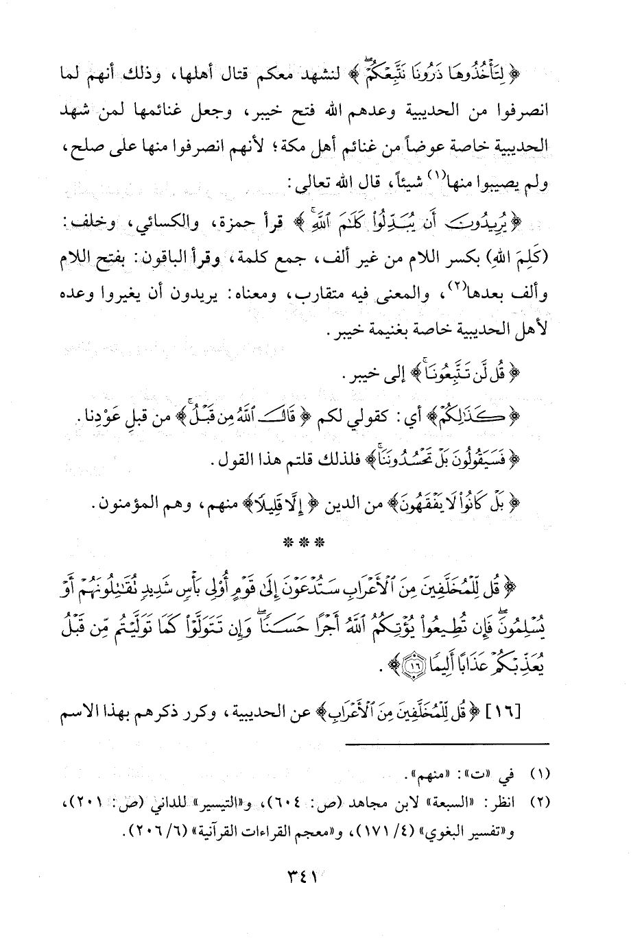 {يُرِيدُونَ أَنْ يُبَدِّلُوا كَلَامَ اللَّهِ} قرأ حمزة، والكسائي، وخلف: (كَلِمَ اللهِ) بكسر اللام من غير ألف، جمع كلمة، وقرأ الباقون: بفتح اللام وألف بعدها (¬2)، والمعنى فيه متقارب، ومعناه: يريدون أن يغيروا وعده لأهل الحديبية خاصة بغنيمة خيبر.