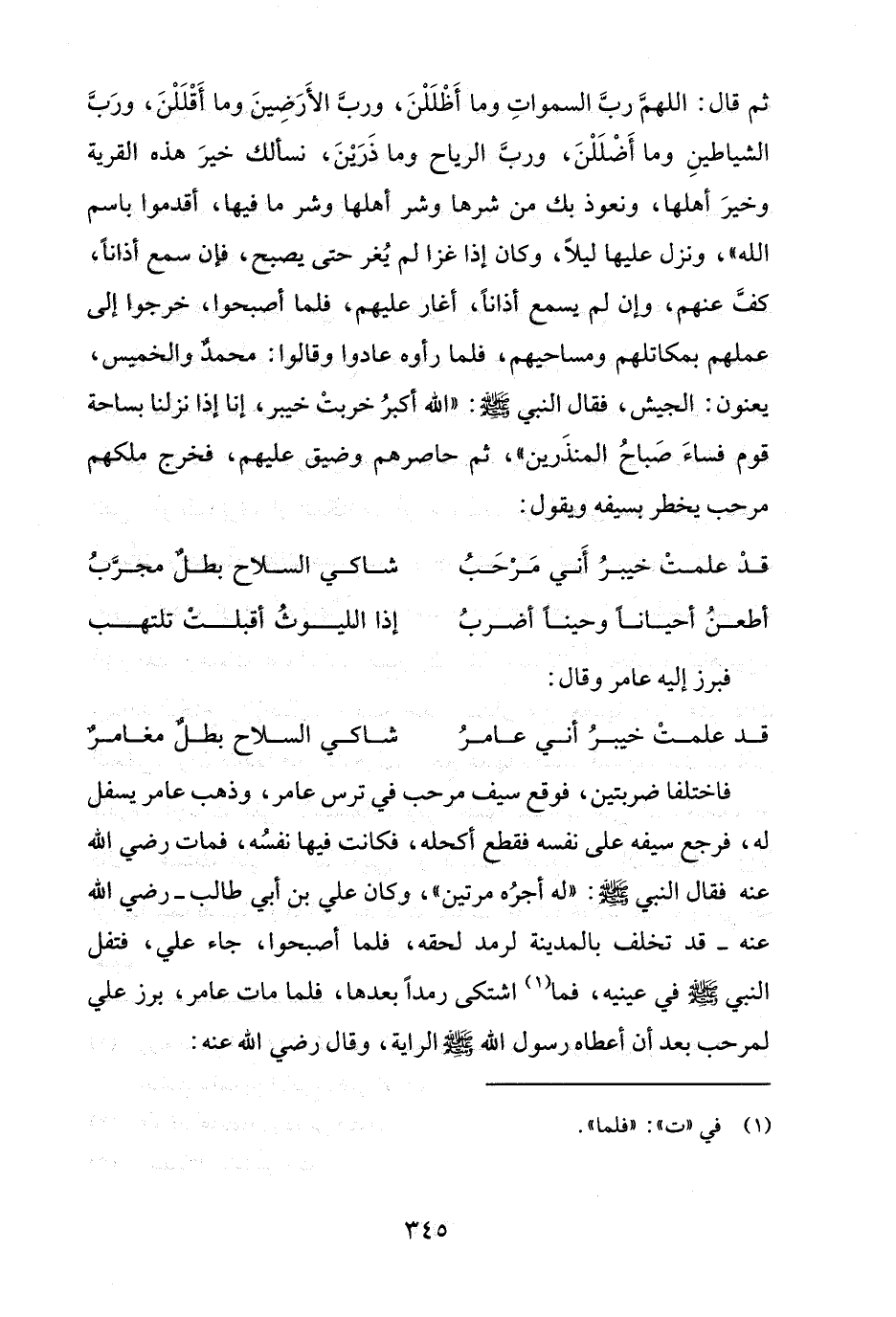 ثم قال: اللهمَّ ربَّ السمواتِ وما أَظْلَلْنَ، وربَّ الأَرَضِينَ وما أَقْلَلْنَ، وربَّ الشياطينِ وما أَضْلَلْنَ، وربَّ الرياح وما ذَرَيْنَ، نسألك خيرَ هذه القرية وخيرَ أهلها، ونعوذ بك من شرها وشر أهلها وشر ما فيها، أقدموا باسم الله"، ونزل عليها ليلًا، وكان إذا غزا لم يُغر حتى يصبح, فإن سمع أذانًا، كفَّ عنهم، وإن لم يسمع أذانًا، أغار عليهم، فلما أصبحوا، خرجوا إلى عملهم بمكاتلهم ومساحيهم، فلما رأوه عادوا وقالوا: محمدٌ والخميس، يعنون: الجيش، فقال النبي - صلى الله عليه وسلم -: "الله أكبرُ خربتْ خيبر، إنا إذا نزلنا بساحة قوم فساءَ صَباحُ المنذَرين"، ثم حاصرهم وضيق عليهم، فخرج ملكهم مرحب يخطر بسيفه ويقول: