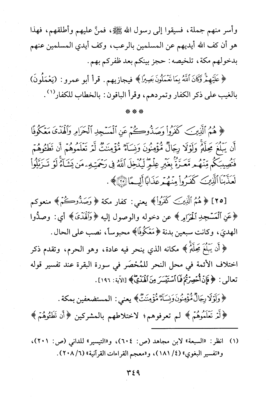 [25] {هُمُ الَّذِينَ كَفَرُوا} يعني: كفار مكة {وَصَدُّوكُمْ} منعوكم {عَنِ الْمَسْجِدِ الْحَرَامِ} عن دخوله والوصول إليه {وَالْهَدْيَ} أي: وصدُّوا الهديَ، وكانت سبعين بدنة {مَعْكُوفًا} محبوسًا، نصب على الحال.