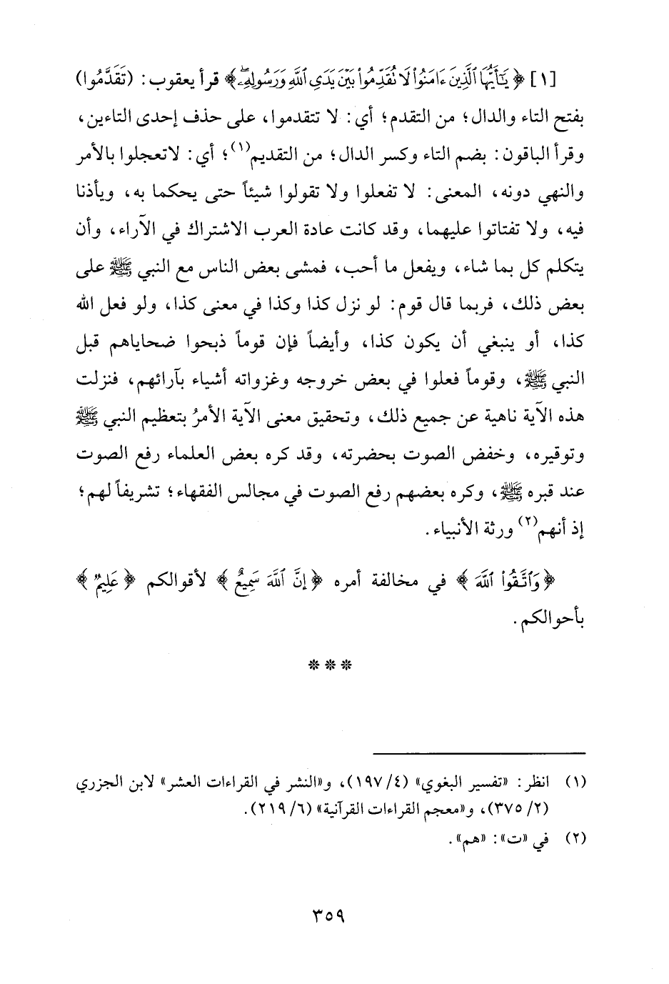 [1] {يَاأَيُّهَا الَّذِينَ آمَنُوا لَا تُقَدِّمُوا بَيْنَ يَدَيِ اللَّهِ وَرَسُولِهِ} قرأ يعقوب: (تَقَدَّمُوا) بفتح التاء والدال؛ من التقدم؛ أي: لا تتقدموا، على حذف إحدى التاءين، وقرأ الباقون: بضم التاء وكسر الدال؛ من التقديم (¬1)؛ أي: لا تعجلوا بالأمر والنهي دونه، المعنى: لا تفعلوا ولا تقولوا شيئًا حتى يحكما به، ويأذنا فيه، ولا تفتاتوا عليهما، وقد كانت عادة العرب الاشتراك في الآراء، وأن يتكلم كل بما شاء، ويفعل ما أحب، فمشى بعض الناس مع النبي - صلى الله عليه وسلم - على بعض ذلك، فربما قال قوم: لو نزل كذا وكذا في معنى كذا، ولو فعل الله كذا، أو ينبغي أن يكون كذا، وأيضًا فإن قومًا ذبحوا ضحاياهم قبل النبي - صلى الله عليه وسلم -، وقومًا فعلوا في بعض خروجه وغزواته أشياء بآرائهم، فنزلت هذه الآية ناهية عن جميع ذلك، وتحقيق معنى الآية الأمرُ بتعظيم النبي - صلى الله عليه وسلم - وتوقيره، وخفض الصوت بحضرته، وقد كره بعض العلماء رفع الصوت عند قبره - صلى الله عليه وسلم -، وكره بعضهم رفع الصوت في مجالس الفقهاء؛ تشريفًا لهم؛ إذ أنهم (¬2) ورثة الأنبياء.