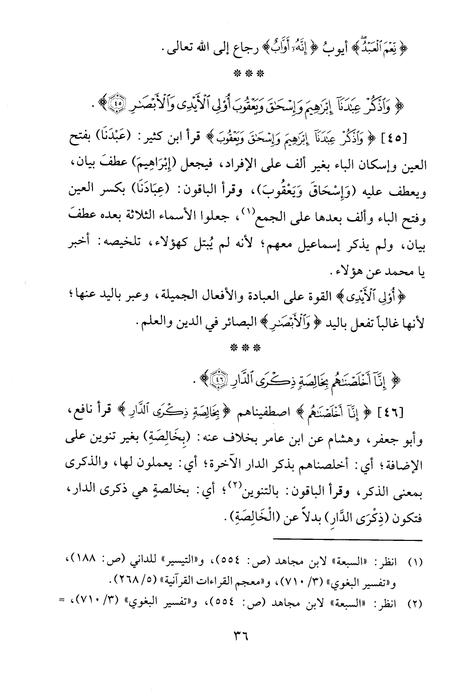 [45] {وَاذْكُرْ عِبَادَنَا إِبْرَاهِيمَ وَإِسْحَاقَ وَيَعْقُوبَ} قرأ ابن كثير: (عَبْدَنَا) بفتح العين وإسكان الباء بغير ألف على الإفراد، فيجعل (إِبْرَاهِيمَ) عطفَ بيان، ويعطف عليه (وَإِسْحَاق وَيَعْقُوبَ)، وقرأ الباقون: (عِبَادَنَا) بكسر العين وفتح الباء وألف بعدها على الجمع (¬1)، جعلوا الأسماء الثلاثة بعده عطفَ بيان، ولم يذكر إسماعيل معهم؛ لأنه لم يُبتل كهؤلاء، تلخيصه: أخبر يا محمد عن هؤلاء.