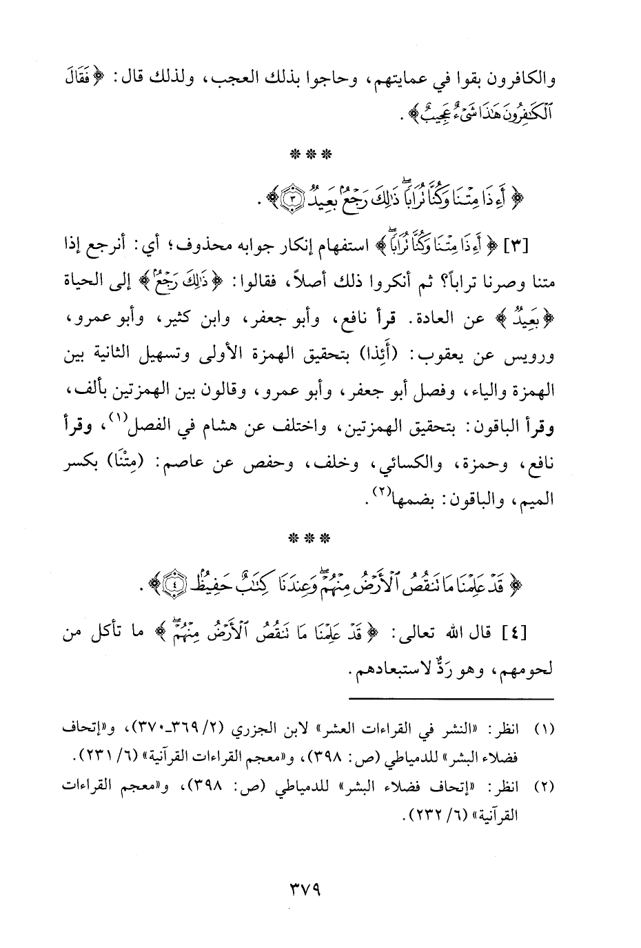 [3] {أَإِذَا مِتْنَا وَكُنَّا تُرَابًا} استفهام إنكار جوابه محذوف؛ أي: أنرجع إذا متنا وصرنا ترابًا؟ ثم أنكروا ذلك أصلًا، فقالوا: {ذَلِكَ رَجْعٌ} إلى الحياة {بَعِيدٌ} عن العادة. قرأ نافع، وأبو جعفر، وابن كثير، وأبو عمرو، ورويس عن يعقوب: (أَئِذا) بتحقيق الهمزة الأولى وتسهيل الثانية بين الهمزة والياء، وفصل أبو جعفر، وأبو عمرو، وقالون بين الهمزتين بألف، وقرأ الباقون: بتحقيق الهمزتين، واختلف عن هشام في الفصل (¬1)، وقرأ نافع، وحمزة، والكسائي، وخلف، وحفص عن عاصم: (مِتْنَا) بكسر الميم، والباقون: بضمها (¬2).
