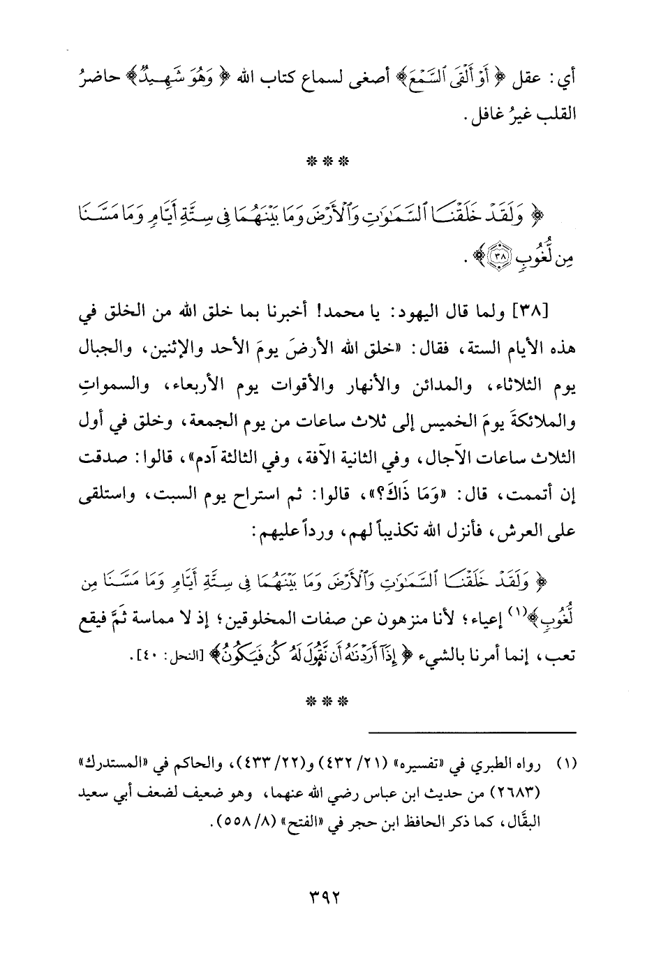 [38] ولما قال اليهود: يا محمد! أخبرنا بما خلق الله من الخلق في هذه الأيام الستة، فقال: "خلق الله الأرْضَ يومَ الأحد والإثنين، والجبال يوم الثلاثاء، والمدائن والأنهار والأقوات يوم الأربعاء، والسمواتِ والملائكةَ يومَ الخميس إلى ثلاث ساعات من يوم الجمعة، وخلق في أول الثلاث ساعات الآجال، وفي الثانية الآفة، وفي الثالثة آدم"، قالوا: صدقت إن أتممت، قال: "وَما ذاكَ؟ "، قالوا: ثم استراح يوم السبت، واستلقى على العرش، فأنزل الله تكذيبًا لهم، وردًّا عليهم: