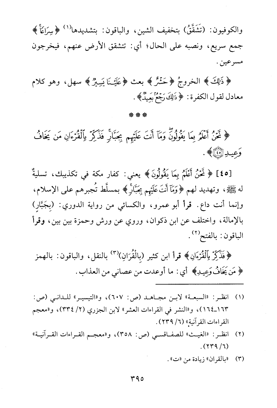[45] {نَحْنُ أَعْلَمُ بِمَا يَقُولُونَ} يعني: كفار مكة في تكذيبك، تسليةٌ له - صلى الله عليه وسلم -، وتهديد لهم {وَمَا أَنْتَ عَلَيْهِمْ بِجَبَّارٍ} بمسلَّط تُجبرهم على الإسلام، وإنما أنت داع. قرأ أبو عمرو، والكسائي من رواية الدوري: (بِجَبّارٍ) بالإمالة، واختلف عن ابن ذكوان، وروي عن ورش وحمزة بين بين، وقرأ الباقون: بالفتح (¬2).
