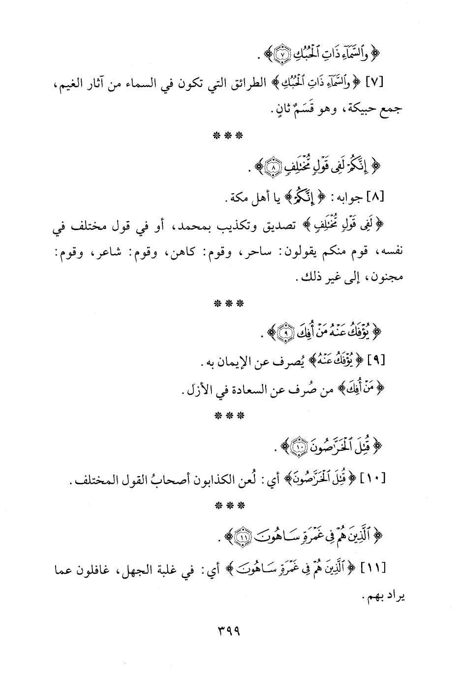 [7] {وَالسَّمَاءِ ذَاتِ الْحُبُكِ} الطرائق التي تكون في السماء من آثار الغيم، جمع حبيكة، وهو قَسَمٌ ثانٍ.
