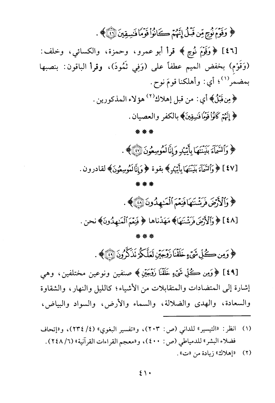 [46] {وَقَوْمَ نُوحٍ} قرأ أبو عمرو، وحمزة، والكسائي، وخلف: (وَقَوْمِ) بخفض الميم عطفًا على (وَفِي ثَمُودَ)، وقرأ الباقون: بنصبها بمضمر (¬1)؛ أي: وأهلكنا قومَ نوح.