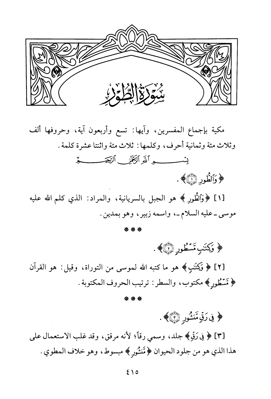 [1] {وَالطُّورِ} هو الجبل بالسريانية، والمراد: الذي كلم الله عليه موسى -عليه السلام-، واسمه زبير، وهو بمدين.