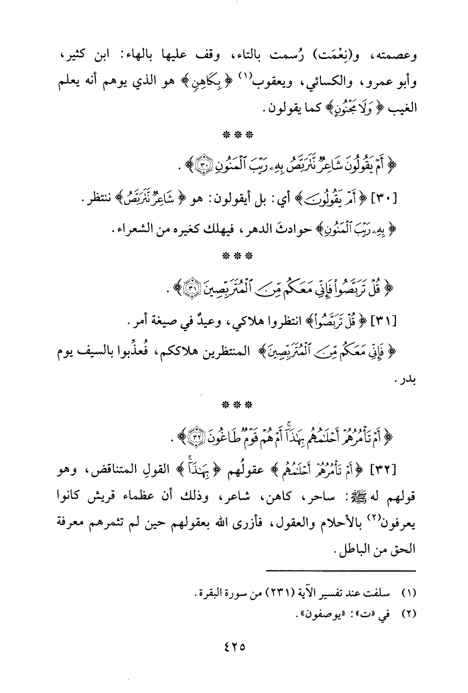 [32] {أَمْ تَأْمُرُهُمْ أَحْلَامُهُمْ} عقولُهم {بِهَذَا} القولِ المتناقض، وهو قولهم له - صلى الله عليه وسلم -: ساحر، كاهن، شاعر، وذلك أن عظماء قريش كانوا يعرفون (¬2) بالأحلام والعقول، فأزرى الله بعقولهم حين لم تثمرهم معرفة الحق من الباطل.