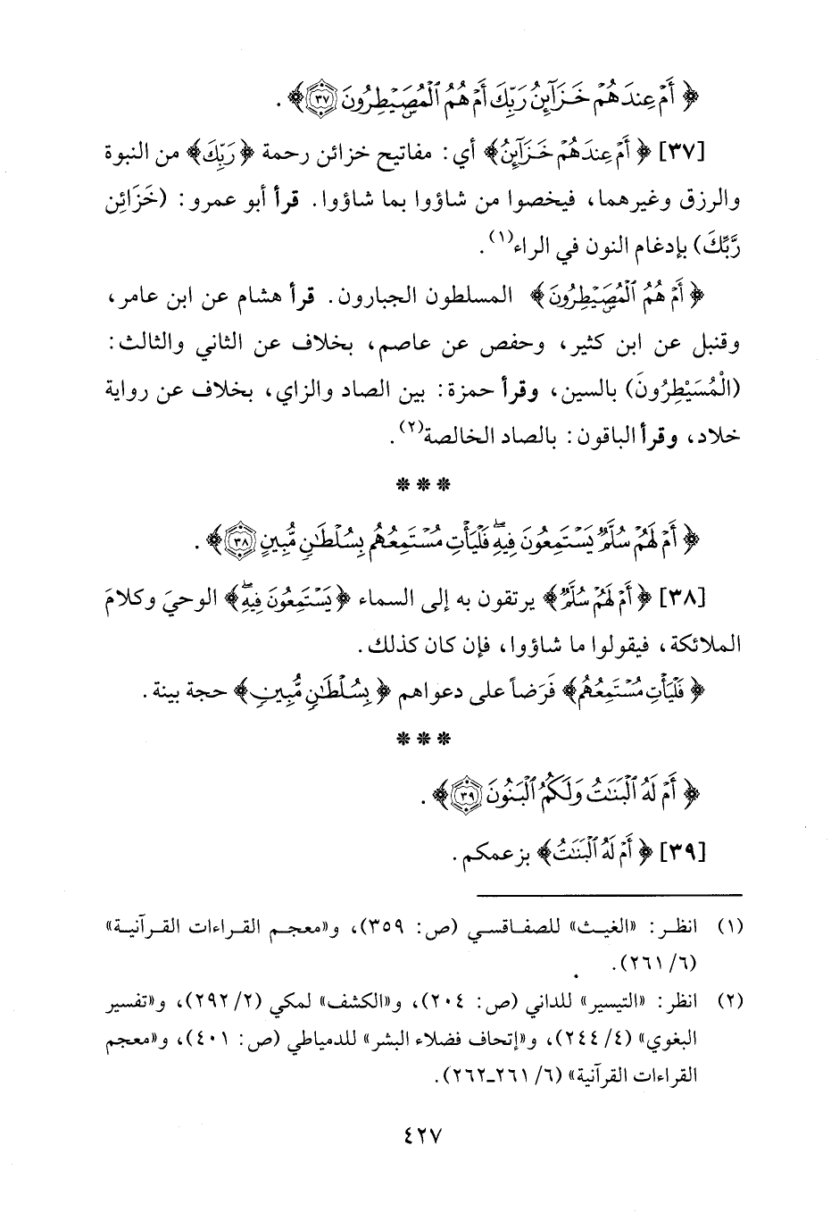 {أَمْ هُمُ الْمُصَيْطِرُونَ} المسلطون الجبارون. قرأ هشام عن ابن عامر، وقنبل عن ابن كثير، وحفص عن عاصم، بخلاف عن الثاني والثالث: (الْمُسَيْطِرُونَ) بالسين، وقرأ حمزة: بين الصاد والزاي، بخلاف عن رواية خلاد، وقرأ الباقون: بالصاد الخالصة (¬2).