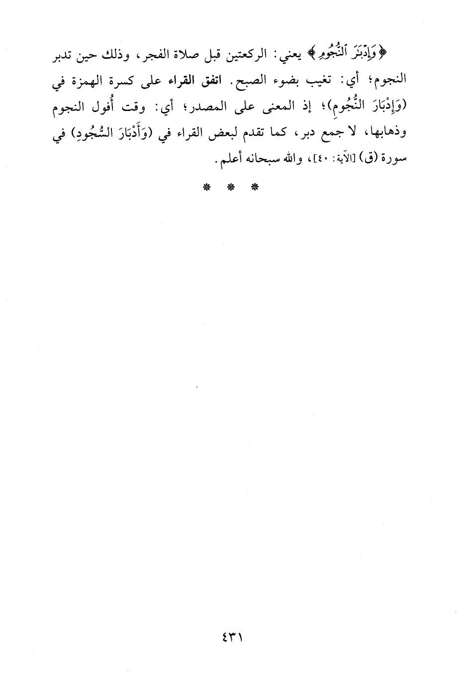 {وَإِدْبَارَ النُّجُومِ} يعني: الركعتين قبل صلاة الفجر، وذلك حين تدبر النجوم؛ أي: تغيب بضوء الصبح. اتفق القراء على كسرة الهمزة في (وَإِدْبارَ النُّجُومِ)؛ إذ المعنى على المصدر؛ أي: وقت أُفول النجوم وذهابها، لا جمع دبر، كما تقدم لبعض القراء في (وَأَدْبارَ السُّجُودِ) في سورة (ق) [الآية: 40]، والله سبحانه أعلم.
