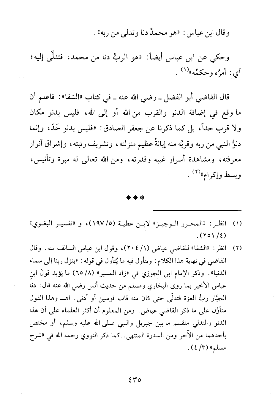 قال القاضي أبو الفضل -رضي الله عنه- في كتاب "الشفا": فاعلم أن ما وقع في إضافة الدنو والقرب من الله أو إلى الله، فليس بدنو مكان ولا قرب حدًّا، بل كما ذكرنا عن جعفر الصادق: "فليس بدنو حَدّ، وإنما دنوُّ النبي من ربه وقربُه منه إبانةُ عظيم منزلته، وتشريف رتبته، وإشراق أنوار معرفته، ومشاهدة أسرار غيبه وقدرته، ومن الله تعالى له مبرة وتأنيس، وبسط وإكرام" (¬2).