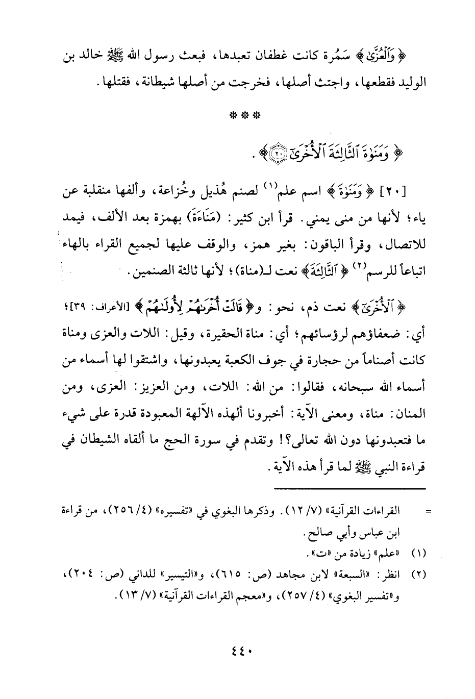 [20] {وَمَنَاةَ} اسم علم (¬1) لصنم هُذيل وخُزاعة، وألفها منقلبة عن ياء؛ لأنها من مني يمني. قرأ ابن كثير: (مَناءَةَ) بهمزة بعد الألف، فيمد للاتصال، وقرأ الباقون: بغير همز، والوقف عليها لجميع القراء بالهاء اتباعًا للرسم (¬2) {الثَّالِثَةَ} نعت لـ (مناة)؛ لأنها ثالثة الصنمين.