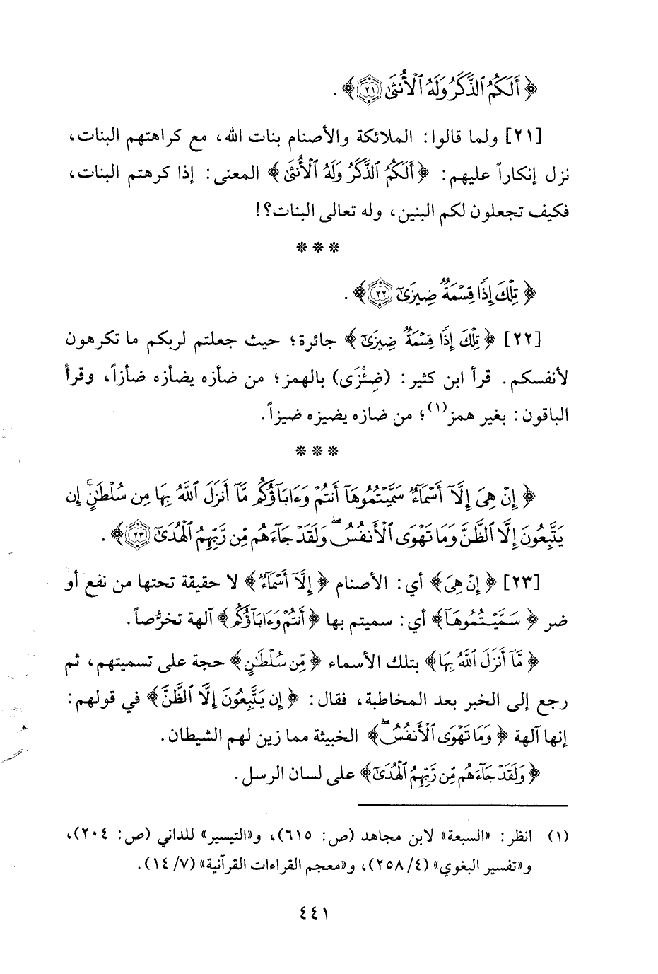 [21] ولما قالوا: الملائكة والأصنام بنات الله، مع كراهتهم البنات، نزل إنكارًا عليهم: {أَلَكُمُ الذَّكَرُ وَلَهُ الْأُنْثَى} المعنى: إذا كرهتم البنات، فكيف تجعلون لكم البنين، وله تعالى البنات؟!